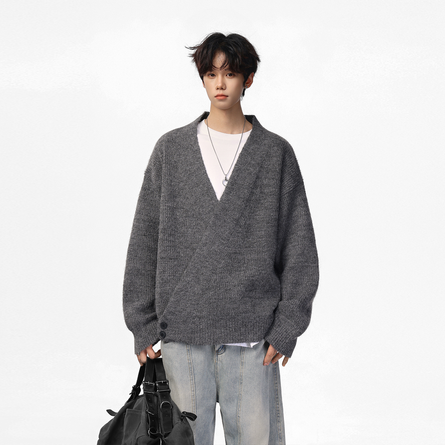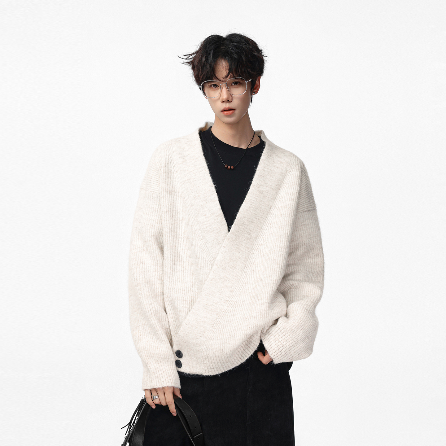 高级感不规则开衫毛衣男生秋冬新款老钱风慵懒宽松百搭保暖针织衫