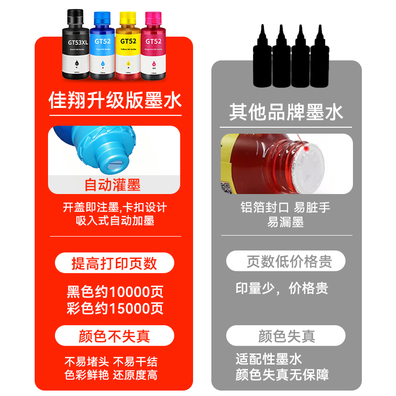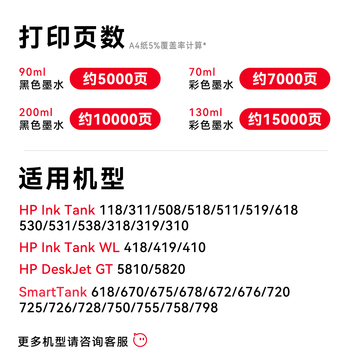 适用HP/惠普tank519墨水GT52彩色GT53XL黑色Tank518 510 531 411 672 725 726 755 798 582 598 678非原装410