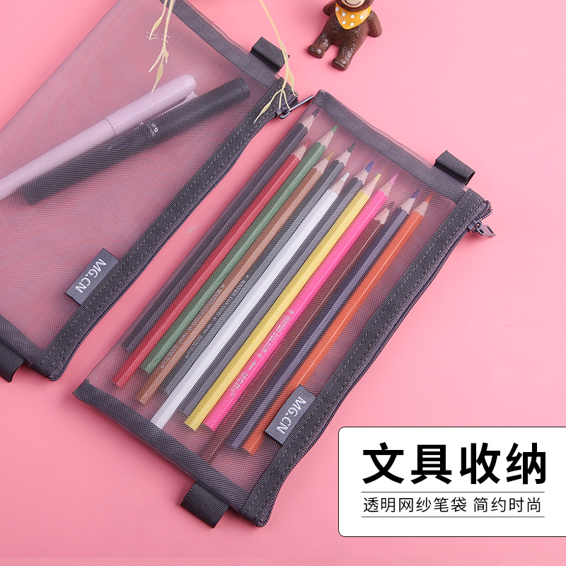 晨光文具网纱笔袋灰黑色大容量中小学生男女高考可用ins风简约铅笔盒尼龙透明可视收纳包单层拉链网格文件袋