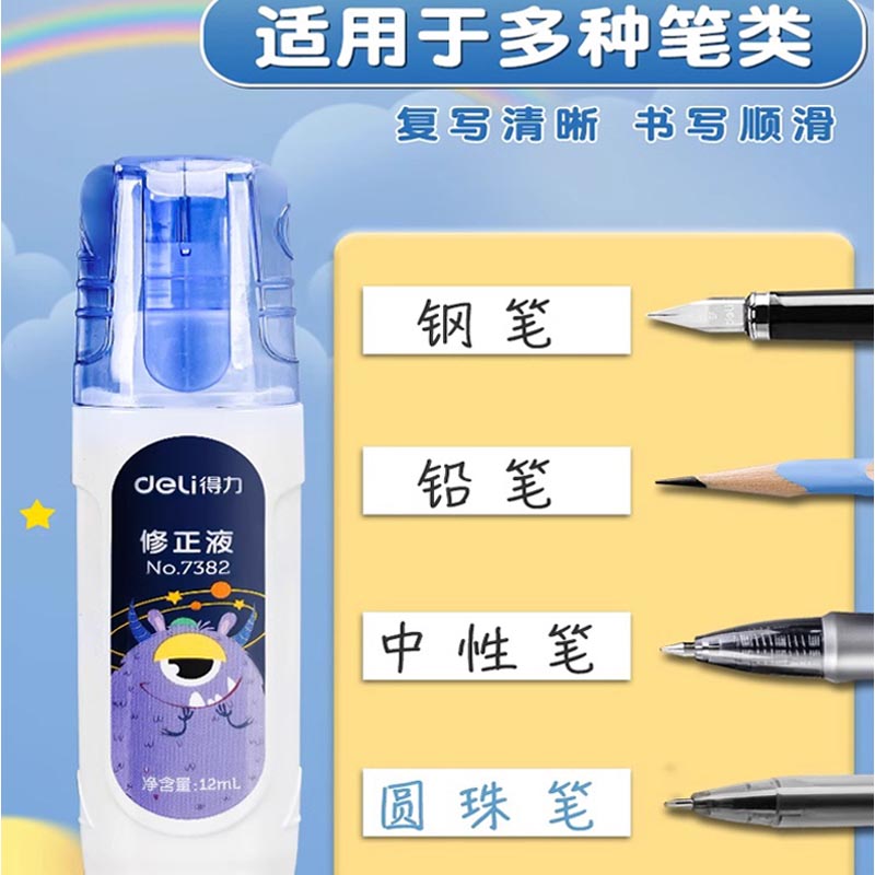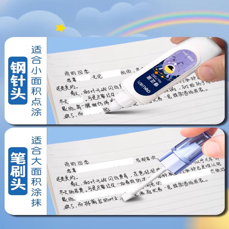 得力涂改液笔刷两用修正液学生用无痕去字消字灵修改液消除笔迹