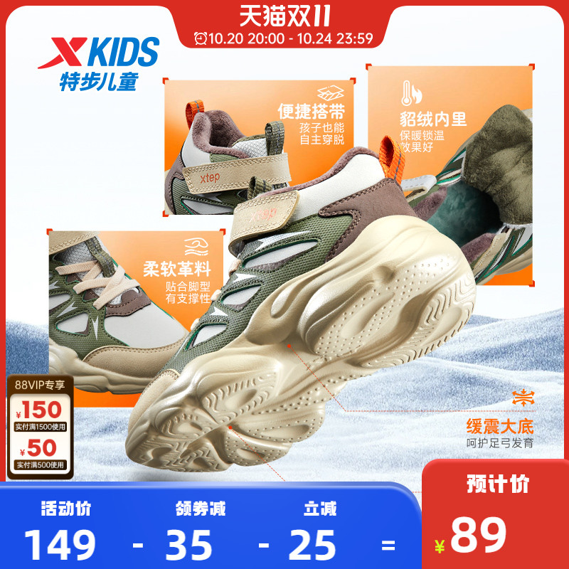特步男童鞋2025秋冬新款保暖魔术贴小童革面运动鞋男耐磨儿童鞋子