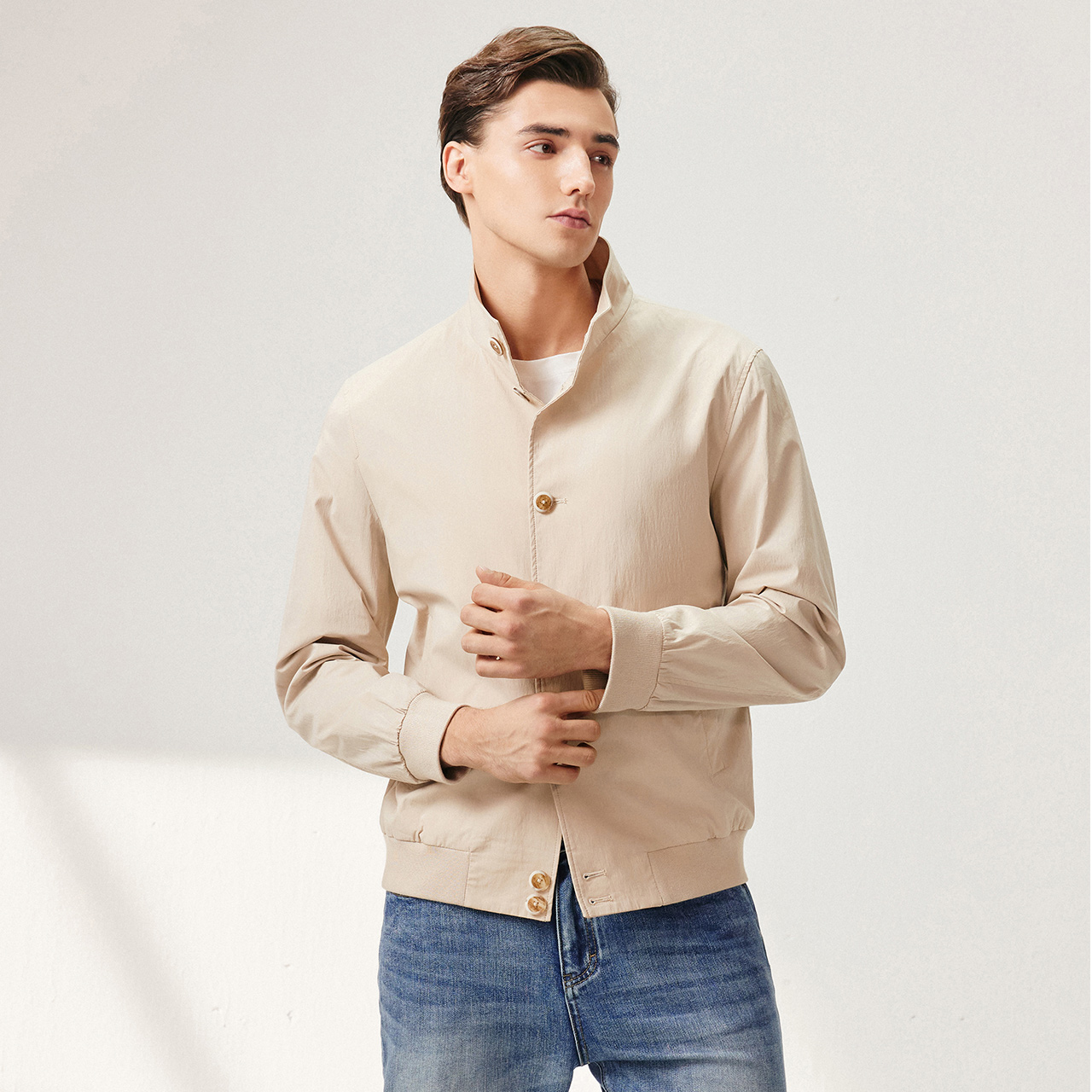 柏品长绒棉立领短款卡其夹克男秋季修身弹力多色可选商务休闲外套