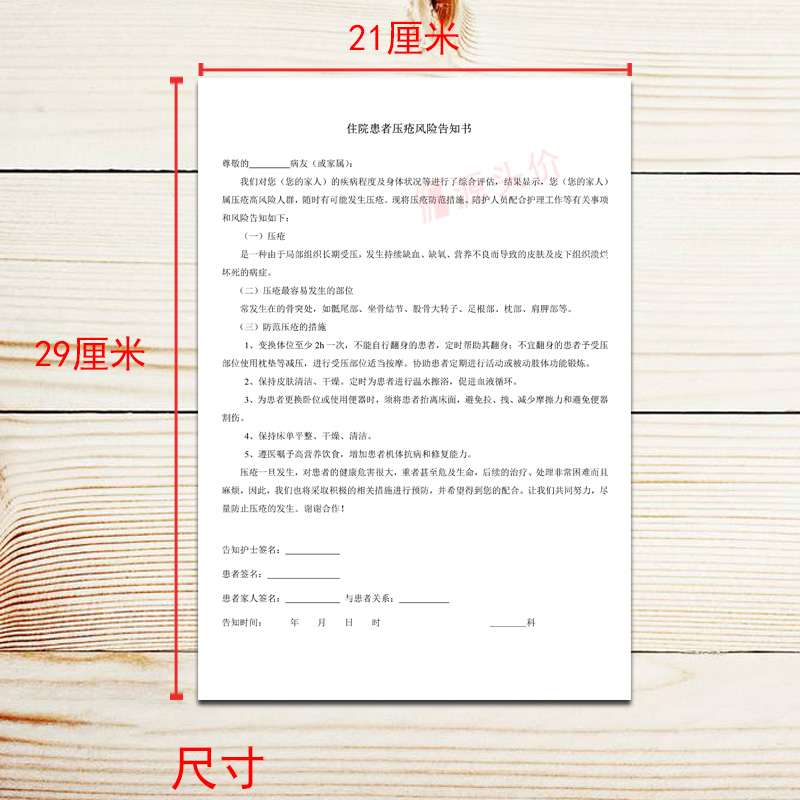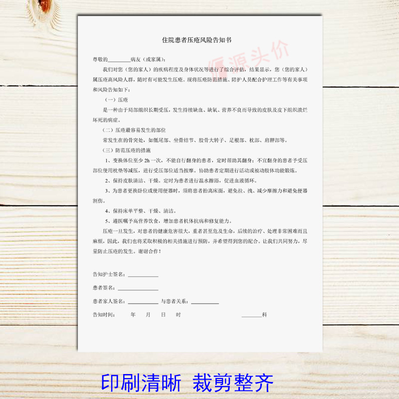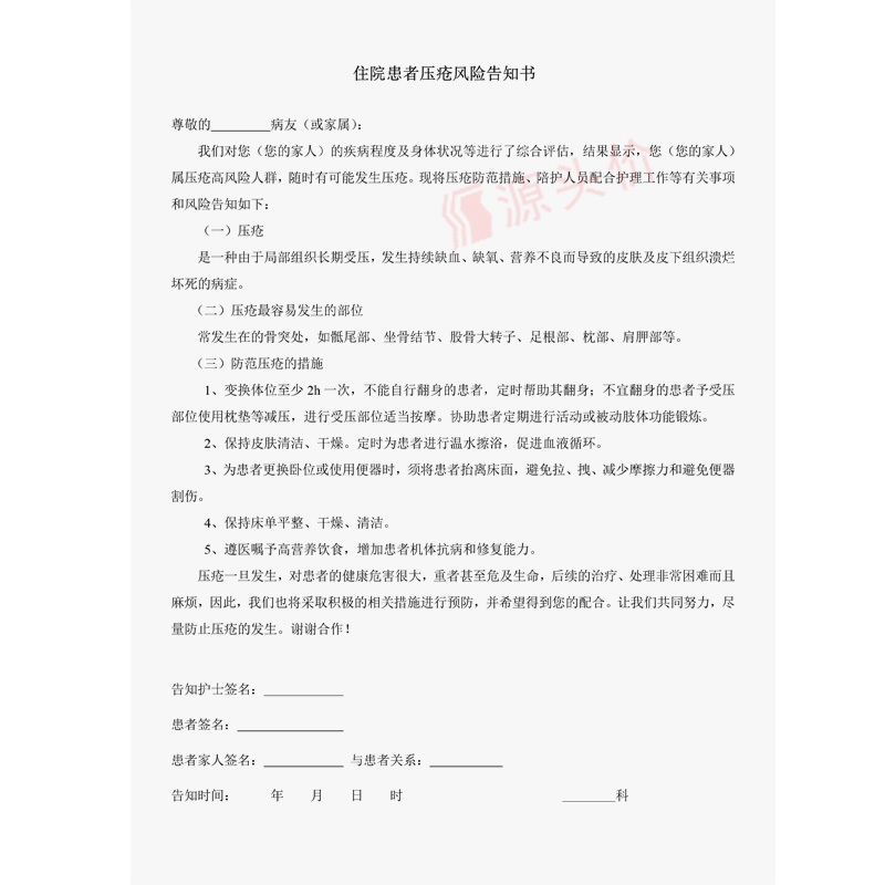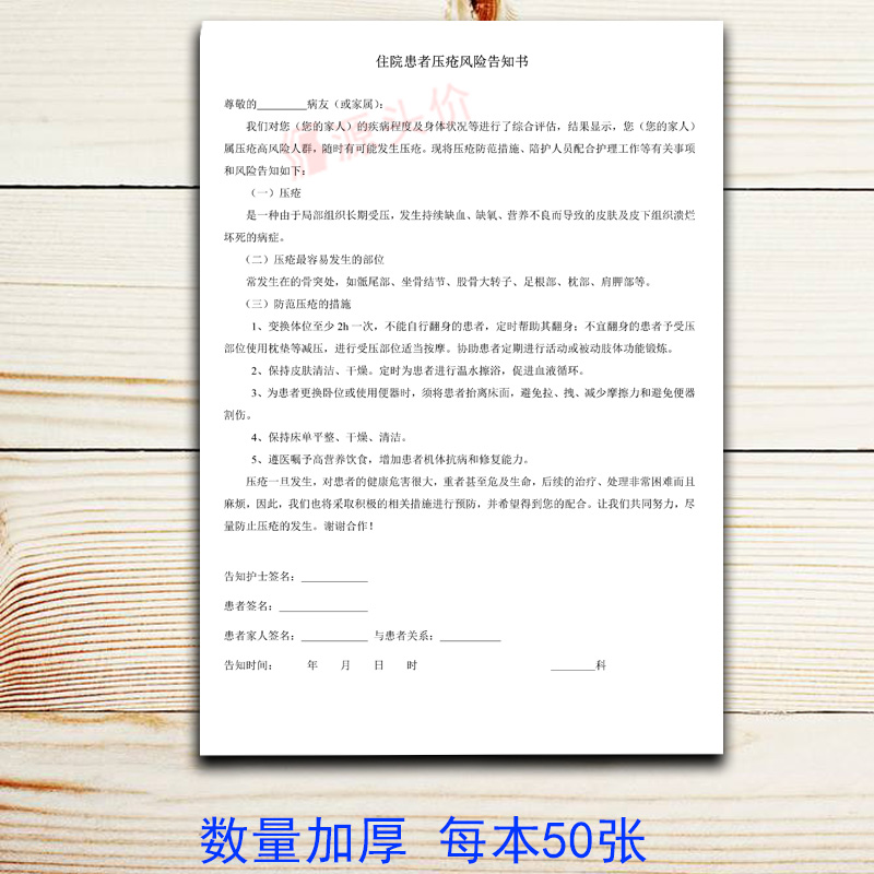 住院患者压疮风险告知书病人医院病情单知情家属医疗机构用表定制