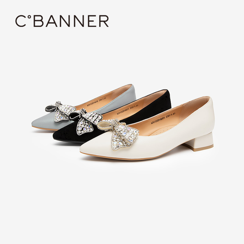 千百度粗跟晚晚鞋秋季新款中跟羊皮浅口尖头单鞋女通勤舒适