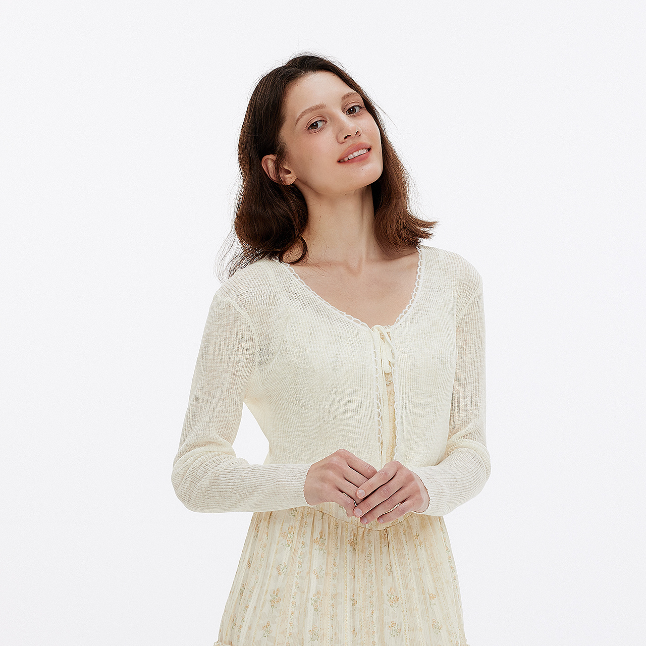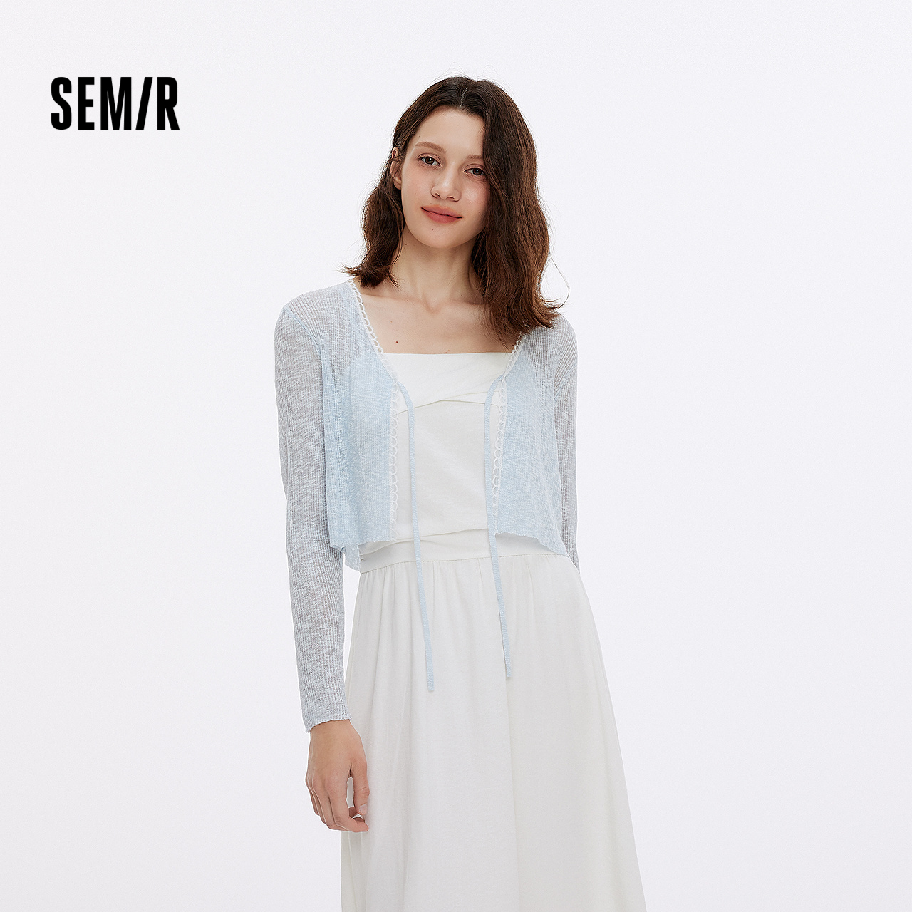森马针织开衫女短款蕾丝V领气质夏季2025新款温柔蝴蝶结修身上衣