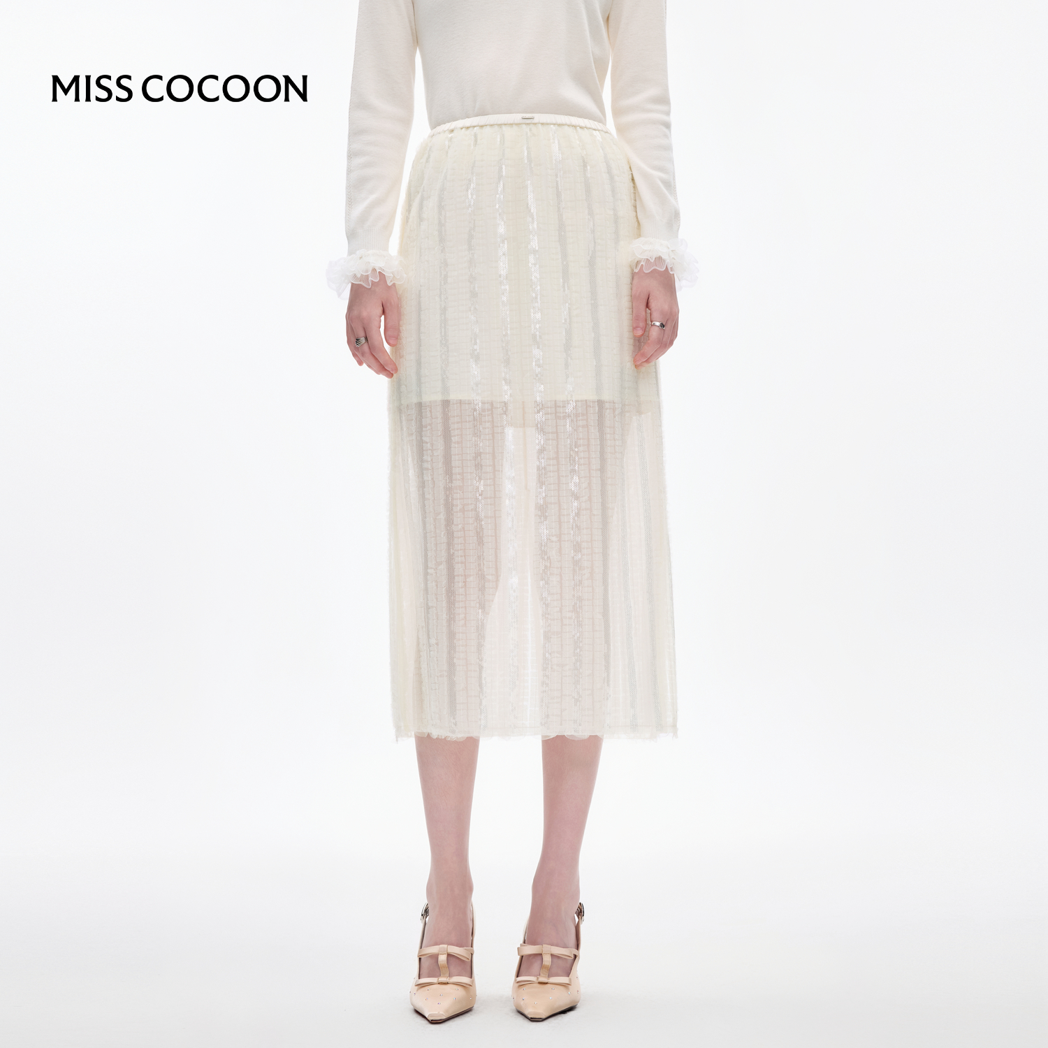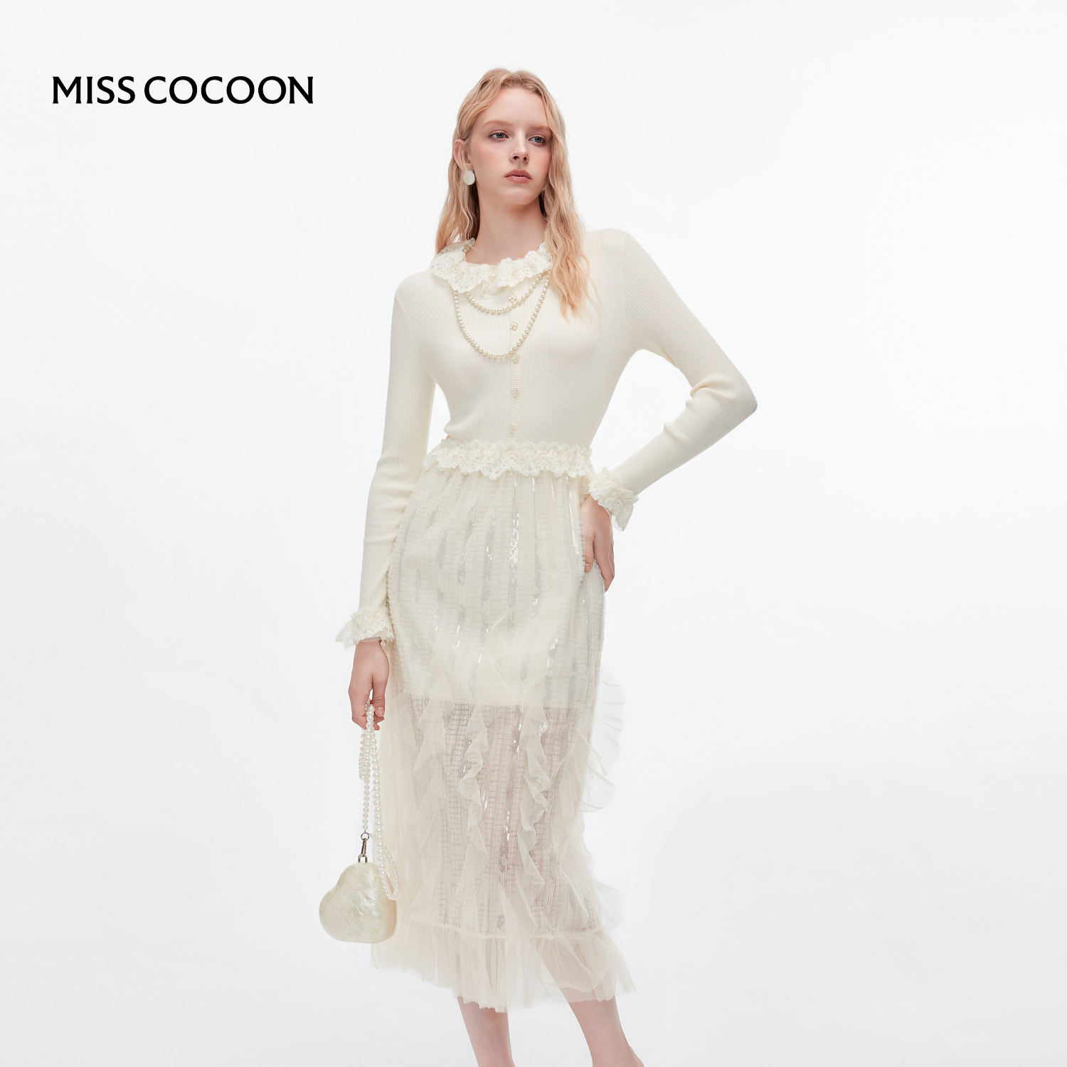 MISSCOCOON可可尼白色针织打底裙女2025秋冬新款千金风拼接连衣裙