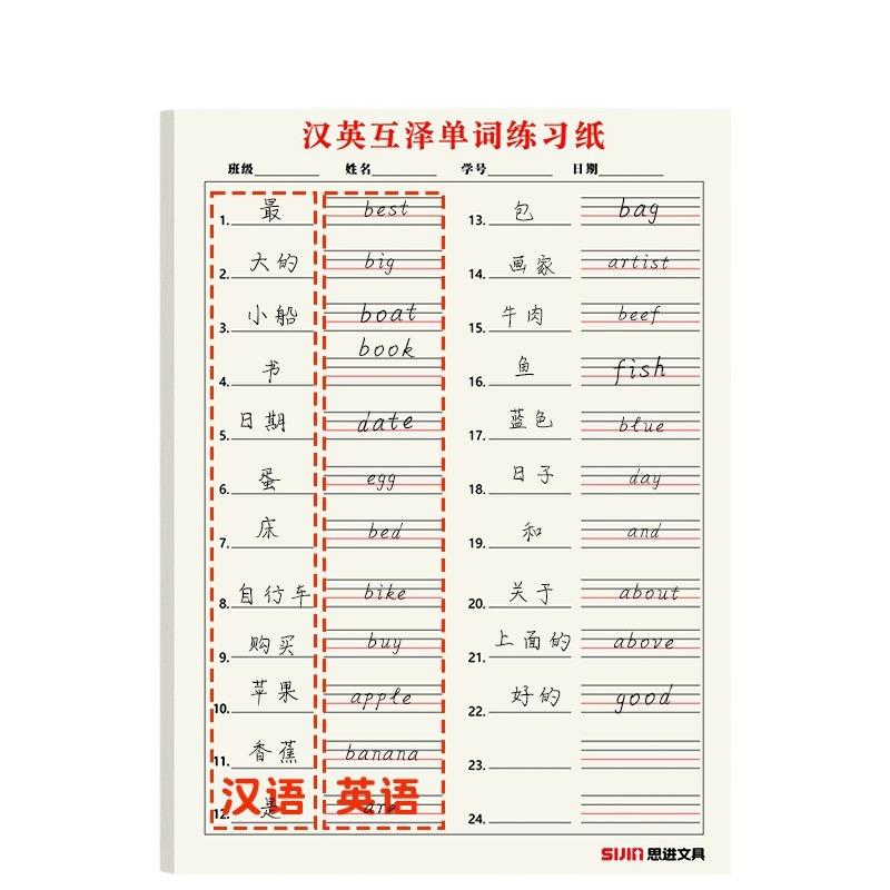 【升级加厚 每本50张】汉英互译练习纸英语单词听写纸单词记忆本