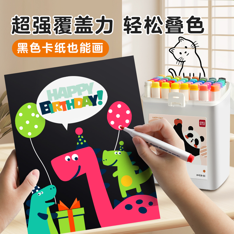 恩米小黑盒直液式丙烯马克笔小学生专用软头美术生儿童手绘画画涂鸦不透色可叠色可水洗彩笔速干防水80色画笔