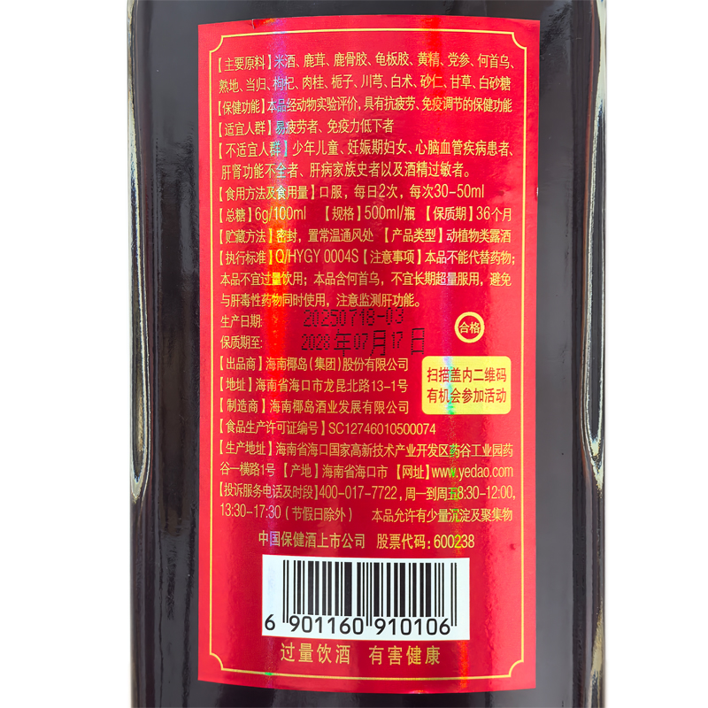 海南椰岛集团椰岛鹿龟酒33度500ml*1瓶/2瓶补酒保健酒养生包邮