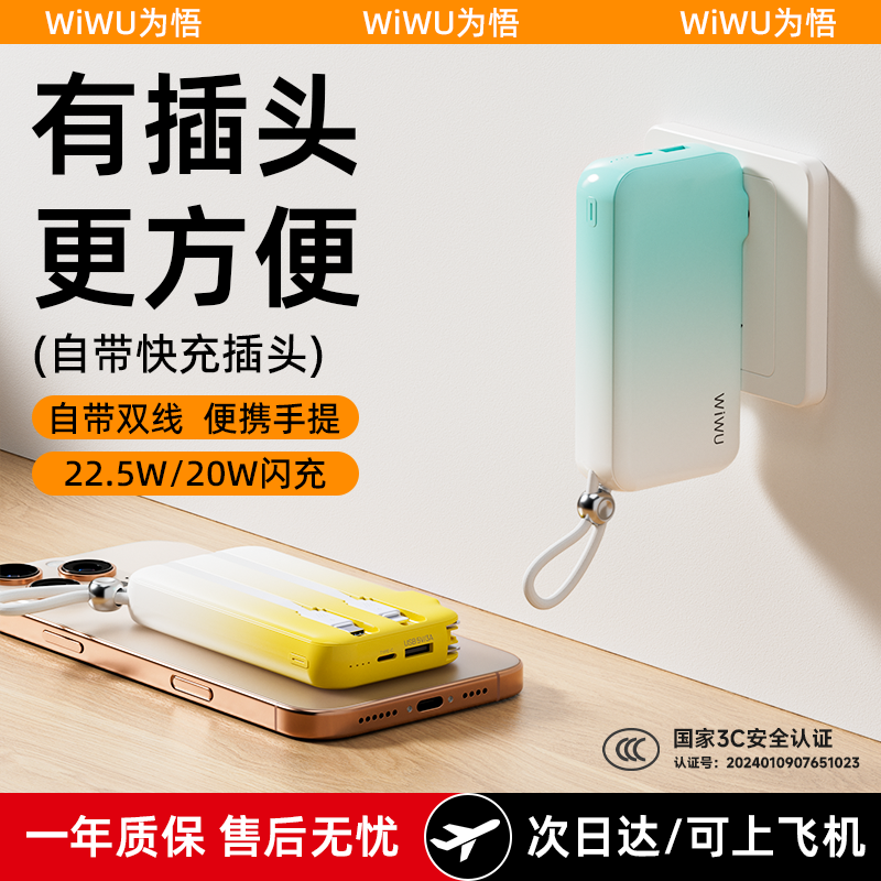 【国家3C认证】WOPOW沃品充电宝小巧便携自带线大容量快充20000毫安可上飞机新款移动电源超迷你型超薄小彩蛋