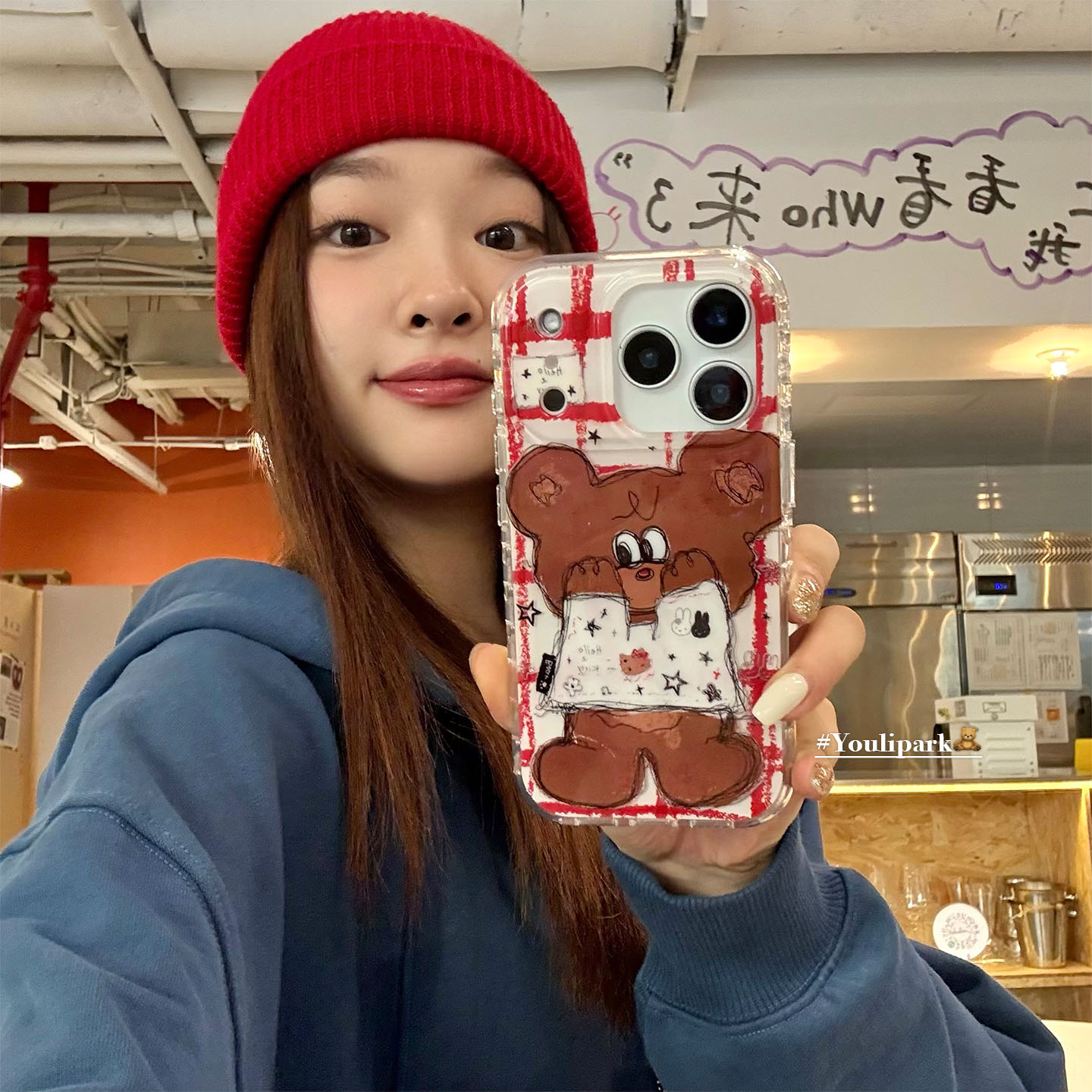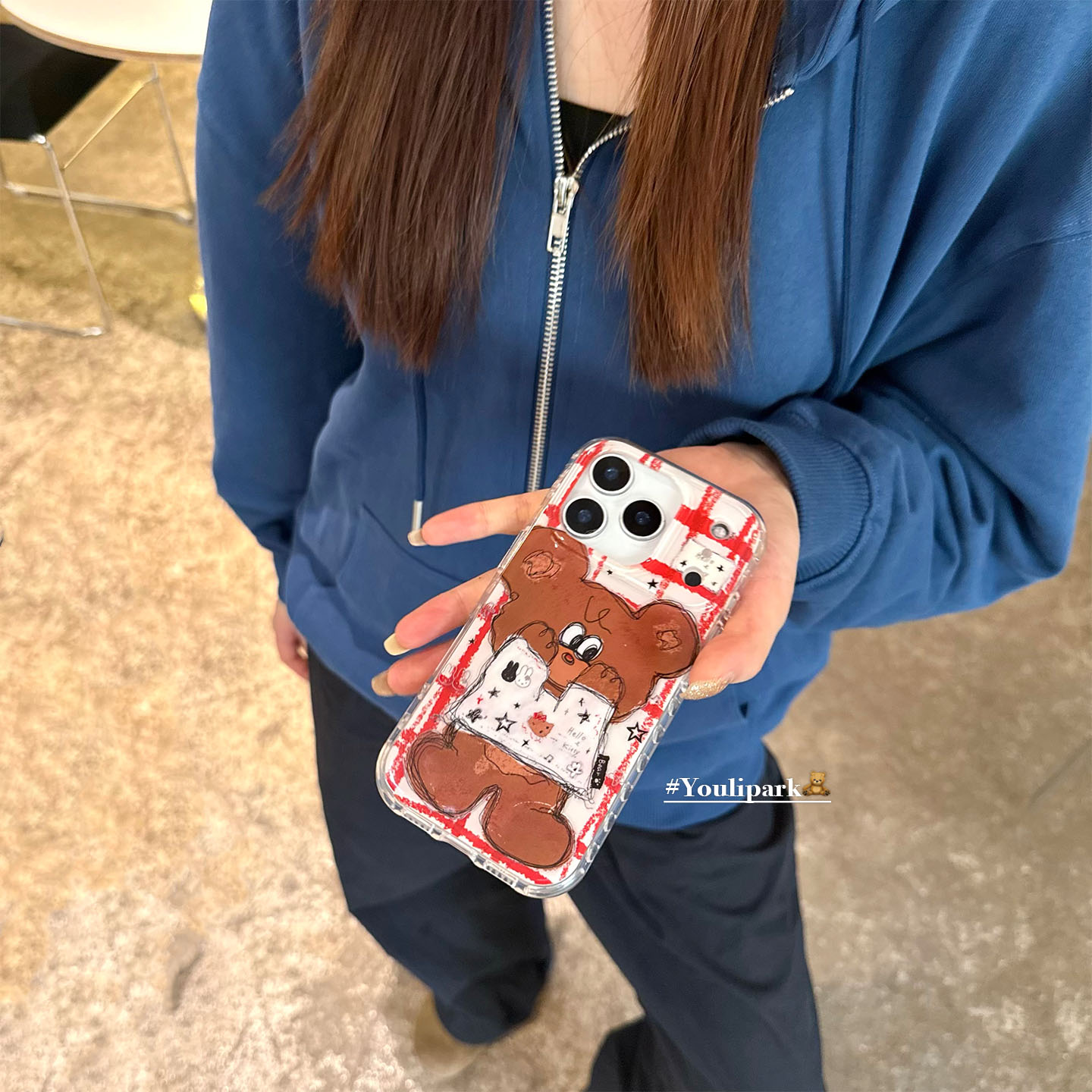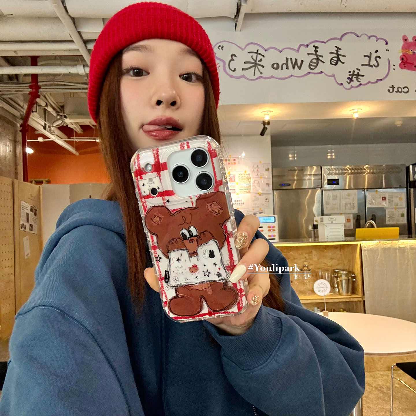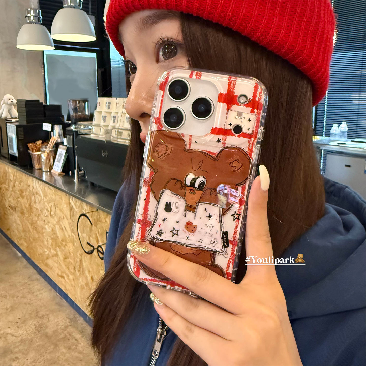 由里公园ins韩系秋冬可爱格纹涂鸦小熊17适用17pro苹果17ProMax手机壳iPhone16全包14新款16Promax保护套13女