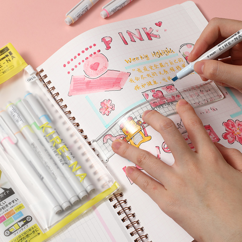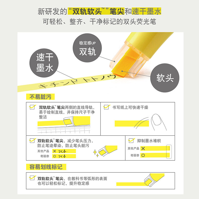 日本PILOT百乐荧光笔KIRE-NA双轨软头荧光笔速干记号笔双头划重点学生用手帐做笔记