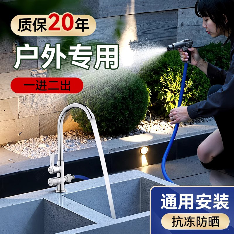 单冷户外庭院水龙头一进二出防冻洗手盆全铜松动加长厨房冷热接口
