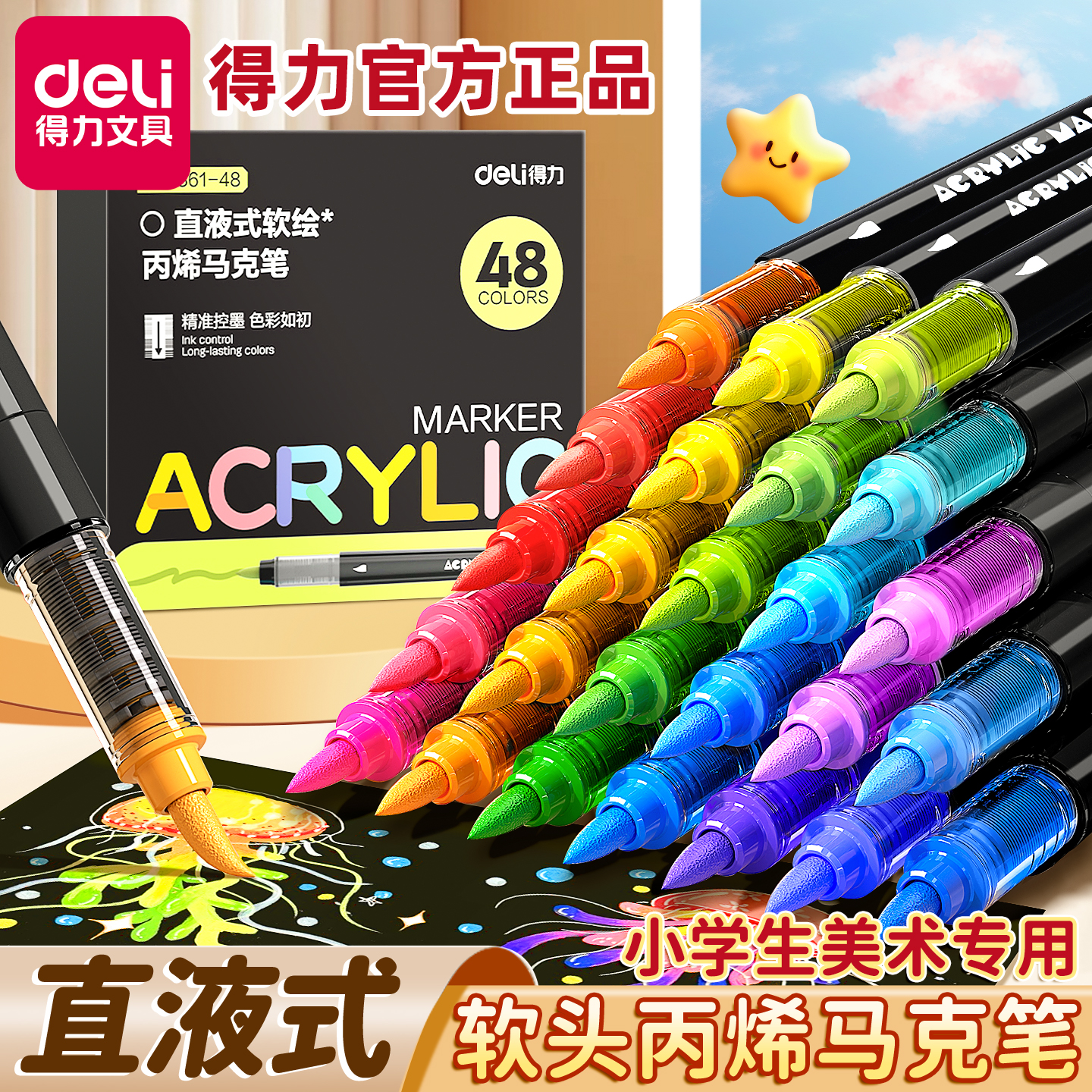 得力直液式软头丙烯马克笔学生美术专用水彩笔84色60色美术生不透色可叠色儿童小学生幼儿园24色36色48色