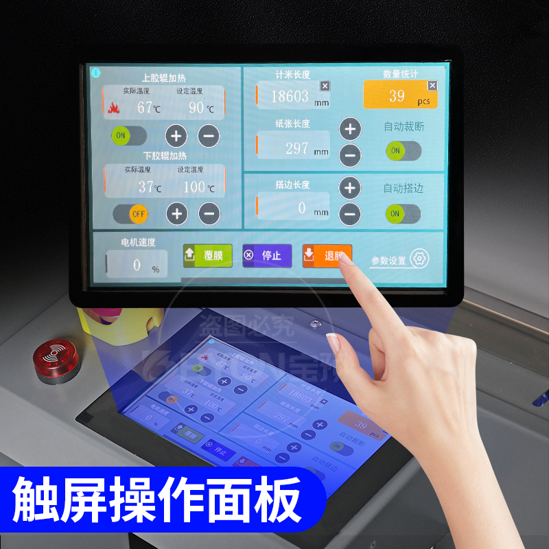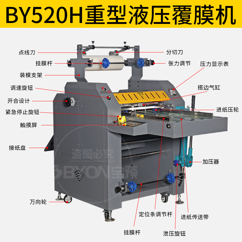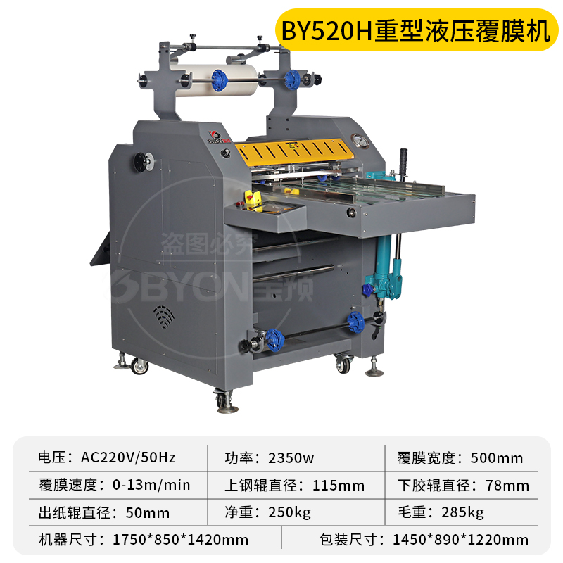 弘文BY-520H重型液压覆膜机大钢辊调速防卷曲自动腹膜机皮带进纸写真不干胶过膜机a3单双面覆膜冷热裱复膜机