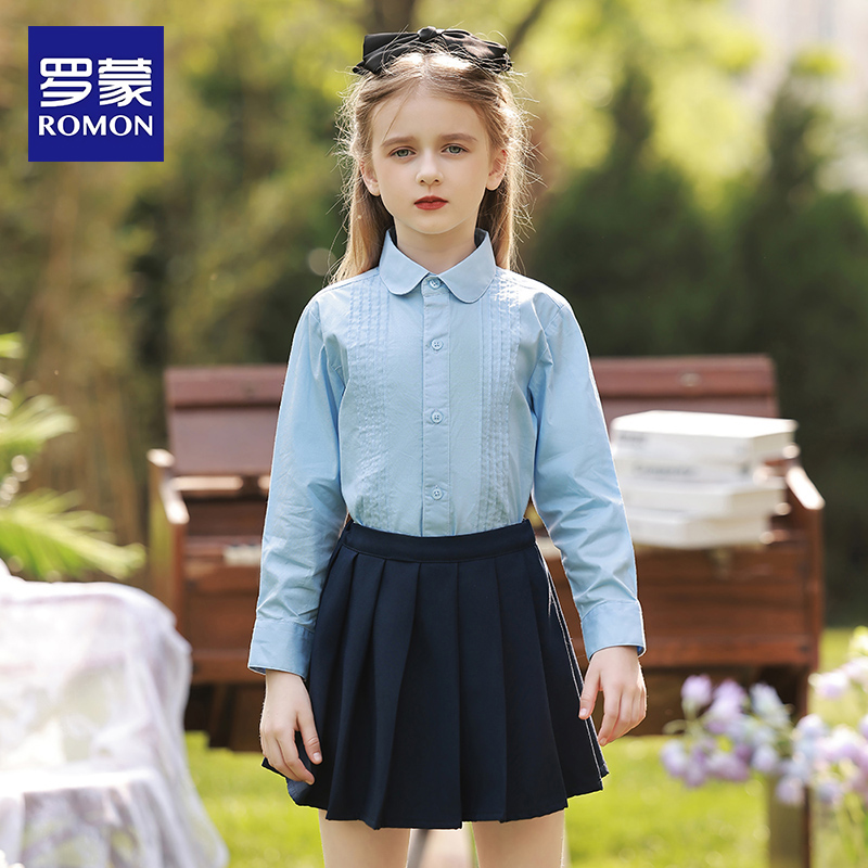 罗蒙女童白色长袖衬衫中小学生春夏季纯蓝色演出棉学院风衬衣套装