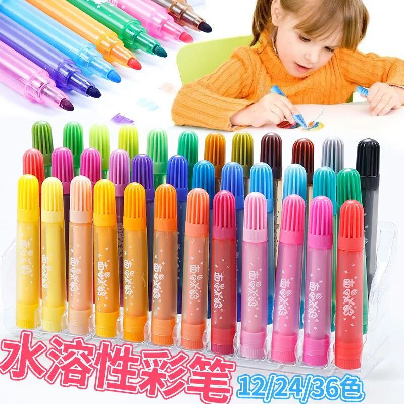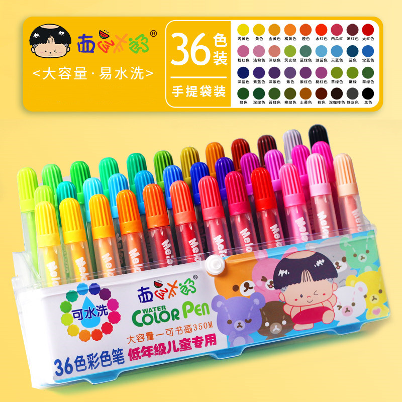西瓜太郎儿童水彩笔套装12 24 36色大容量绘画笔安全可水洗彩色笔粗笔头圆杆手提盒装幼儿小学生环保彩色水笔