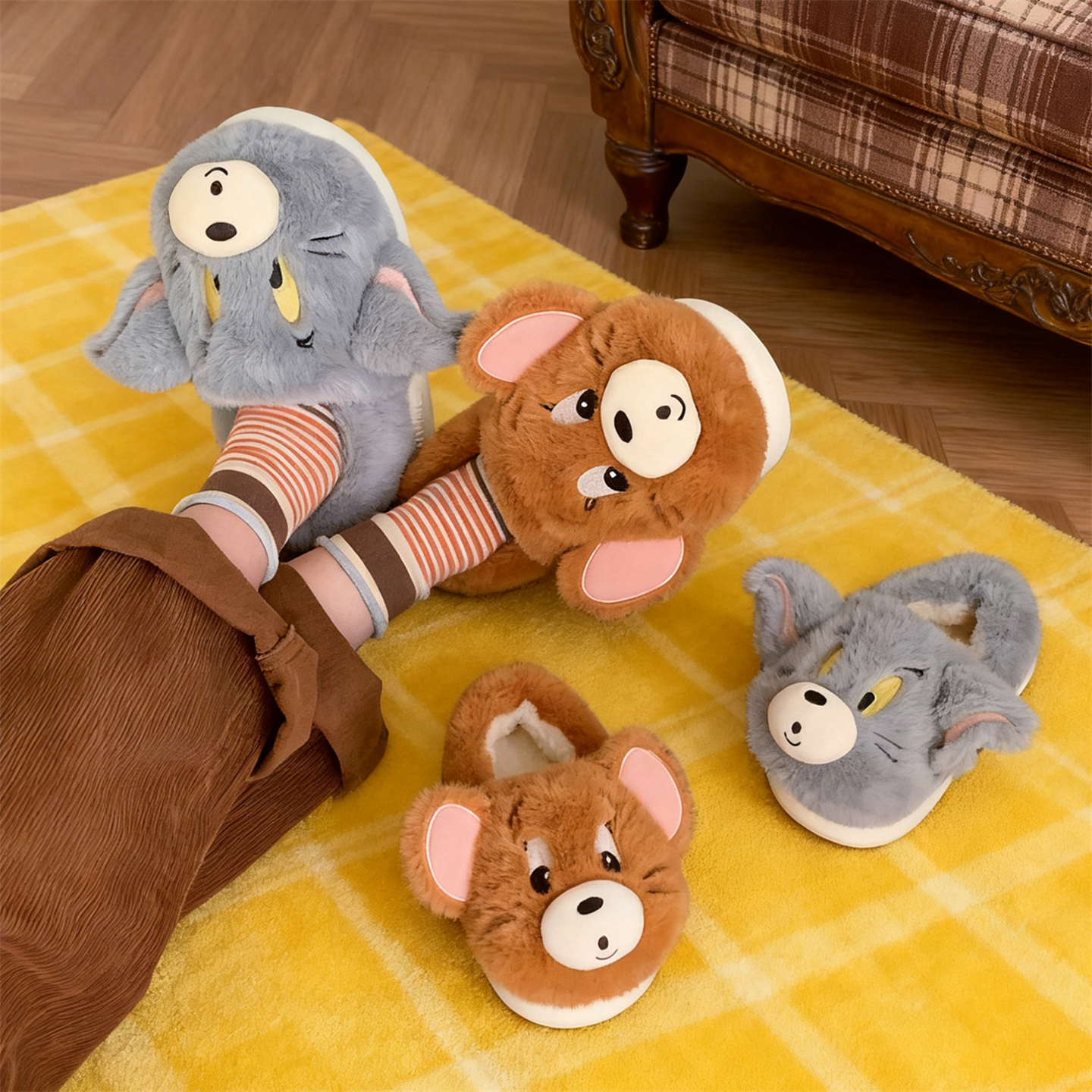 细细条 正版猫和老鼠儿童亲子棉拖鞋ins冬可爱汤姆杰瑞居家毛毛鞋