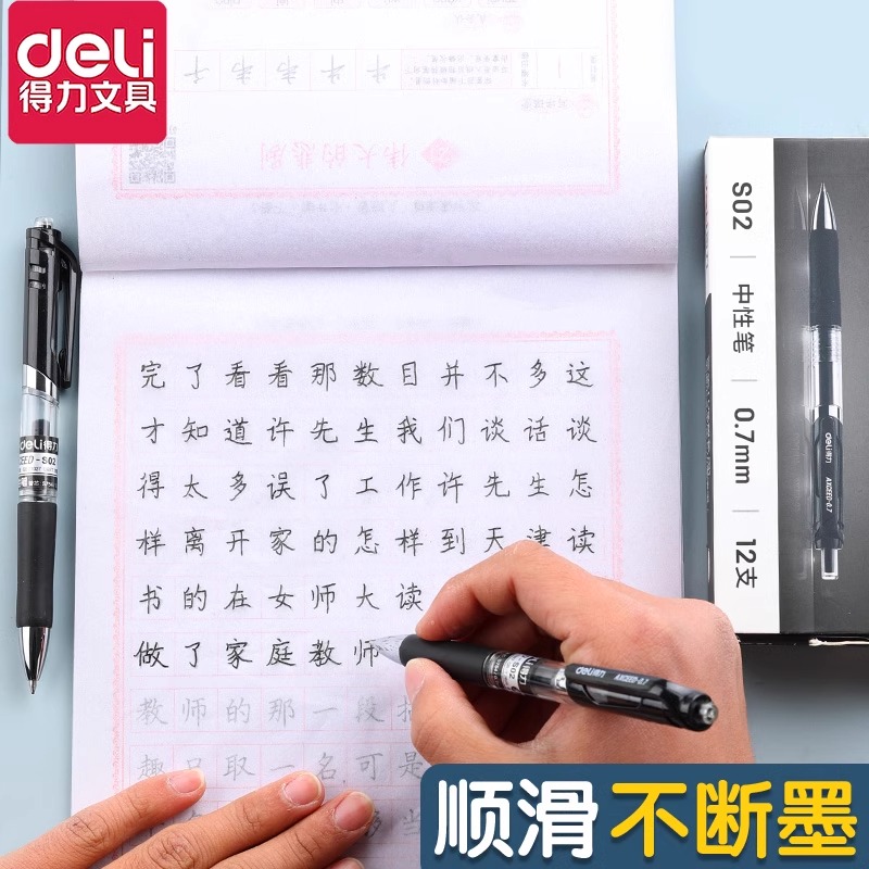 得力加粗按动中性笔学生用黑色0.7mm子弹头水笔黑笔粗头硬笔书法专用笔练字笔碳素笔圆珠笔水性签字笔黑笔S02
