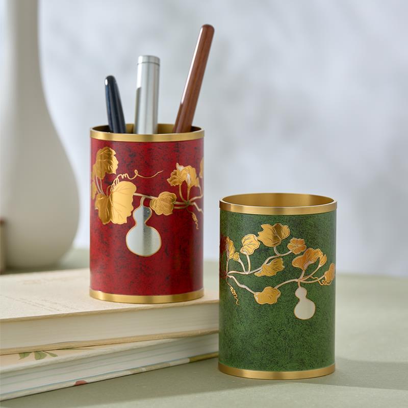 创意中国风纯铜笔筒收纳盒大容量学生桌面笔筒轻奢高级感黄铜笔筒