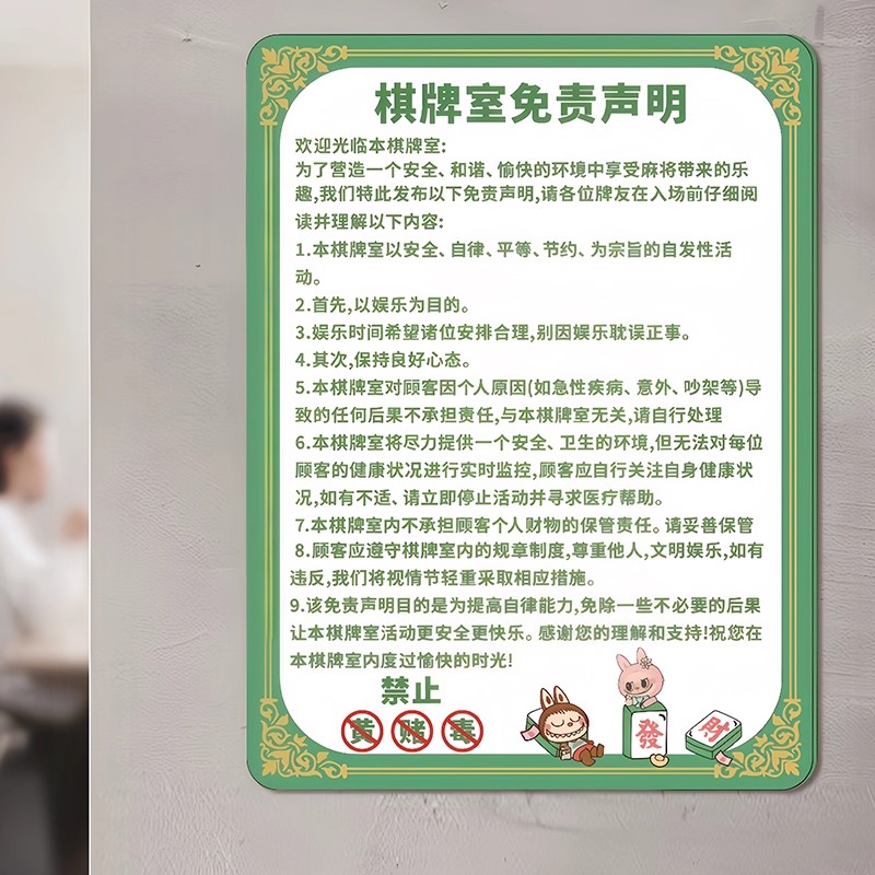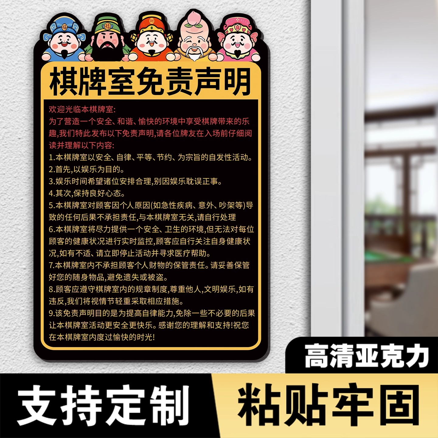 棋牌室免责声明提示牌禁止黄赌毒警示牌亚克力警示标语牌麻将馆温馨提示标识牌未成年禁止入内警示标语牌墙贴