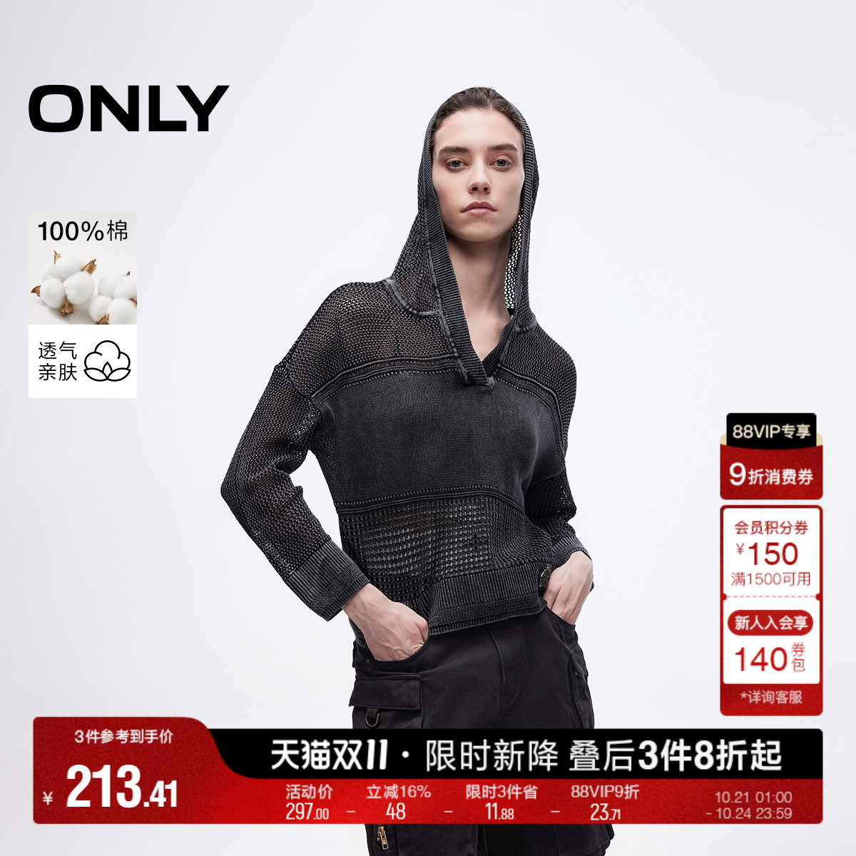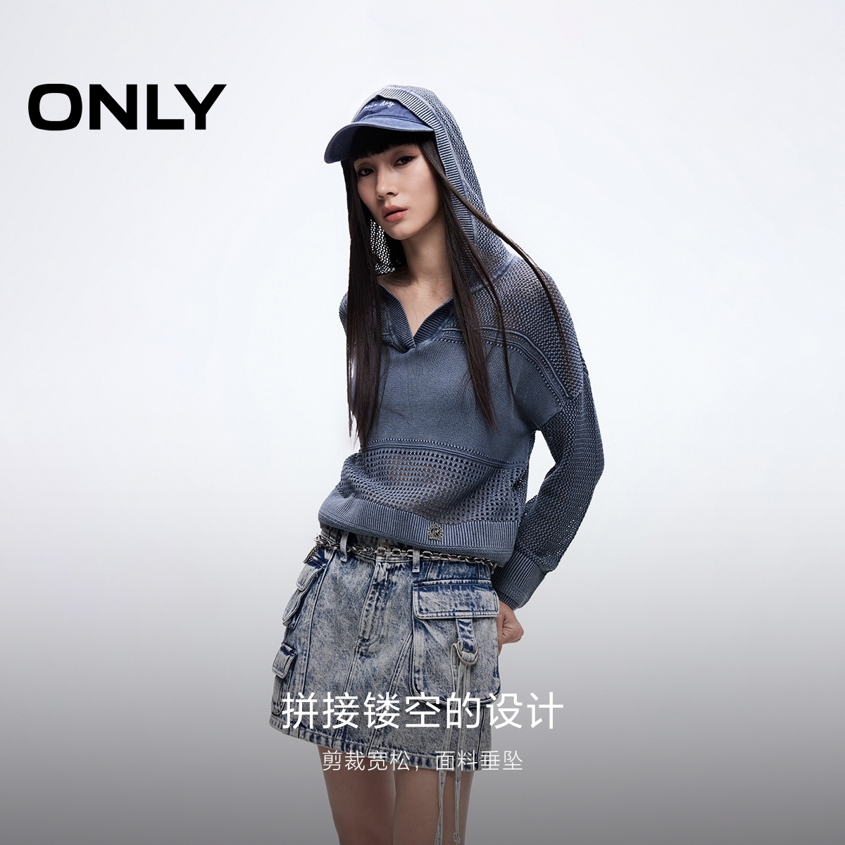 ONLY2025秋季新款个性拼接网纱质感做旧磨白宽松连帽针织衫女