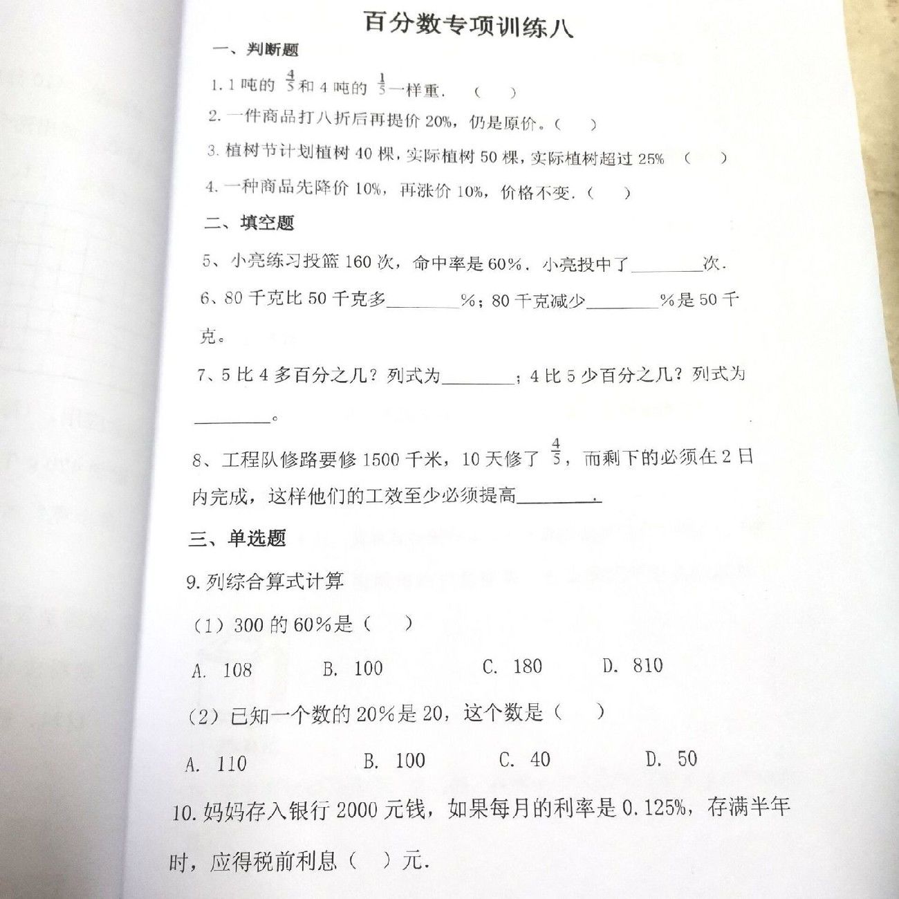六年级数学上册认识百分数的应用计算百分数表示数专项训练题本