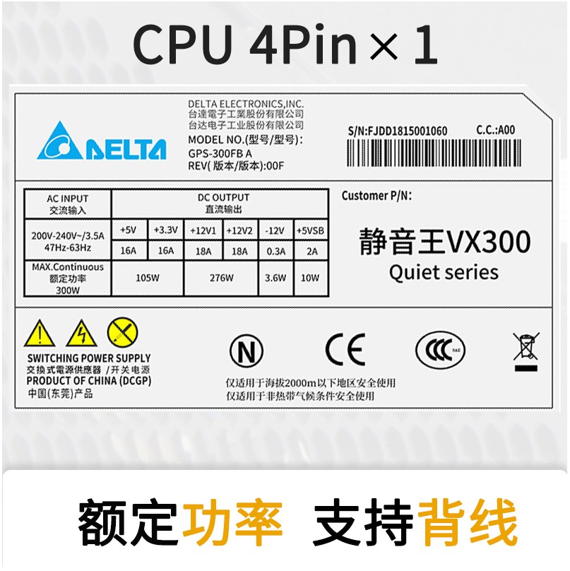 台达电源VX300/350W静音王宽幅台式机主动式PFC办公电脑机箱电源