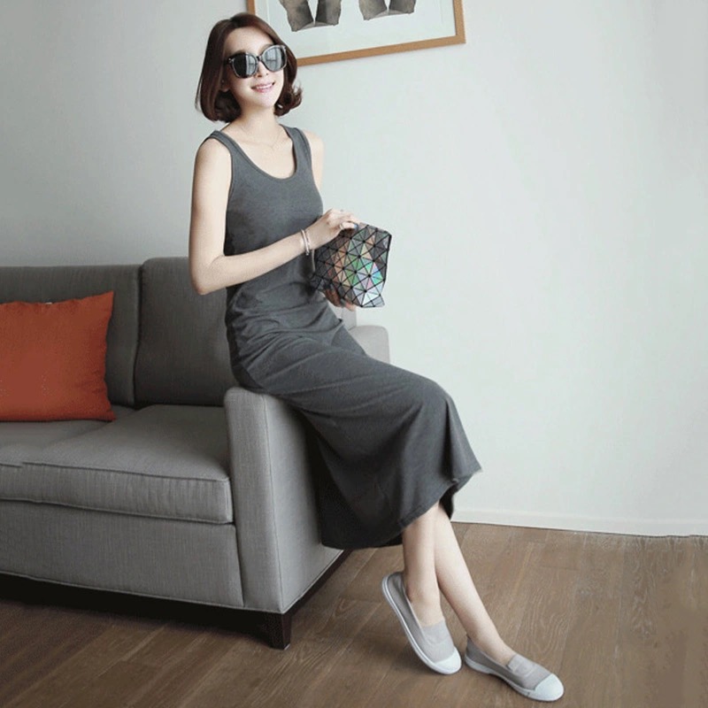 2025夏季中长款背心裙纯色圆领宽松大码遮肚显瘦新中式无袖连衣裙