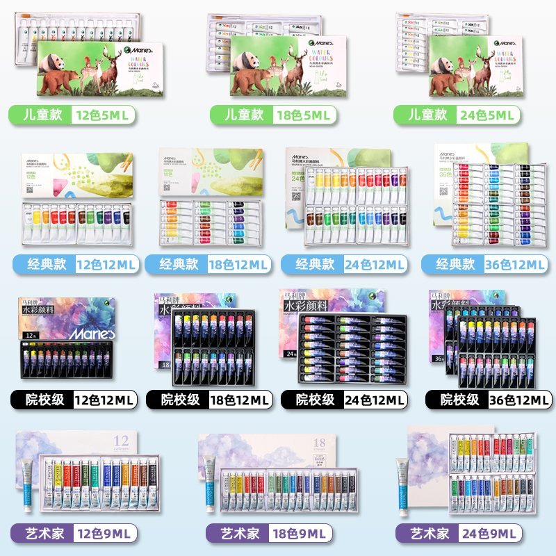 马利水彩颜料套装美术生专用18色24色36色管装固体水彩颜料色彩涂鸦画画工具绘画全套艺术家高级