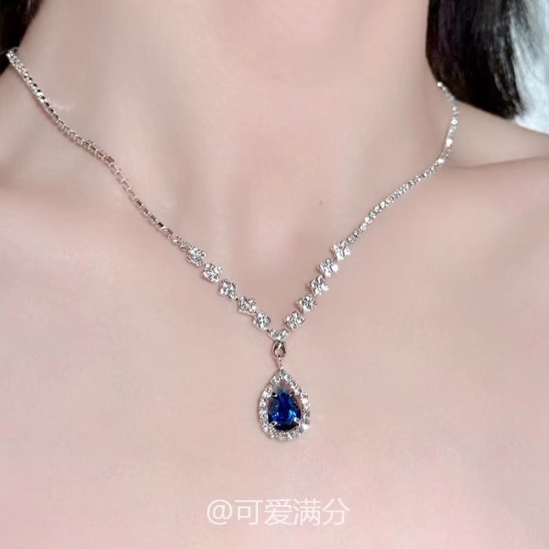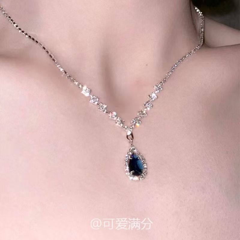 「蓝沁星河」法式爆闪墨蓝色水滴锆石项链精致高颜值千金感锁骨链