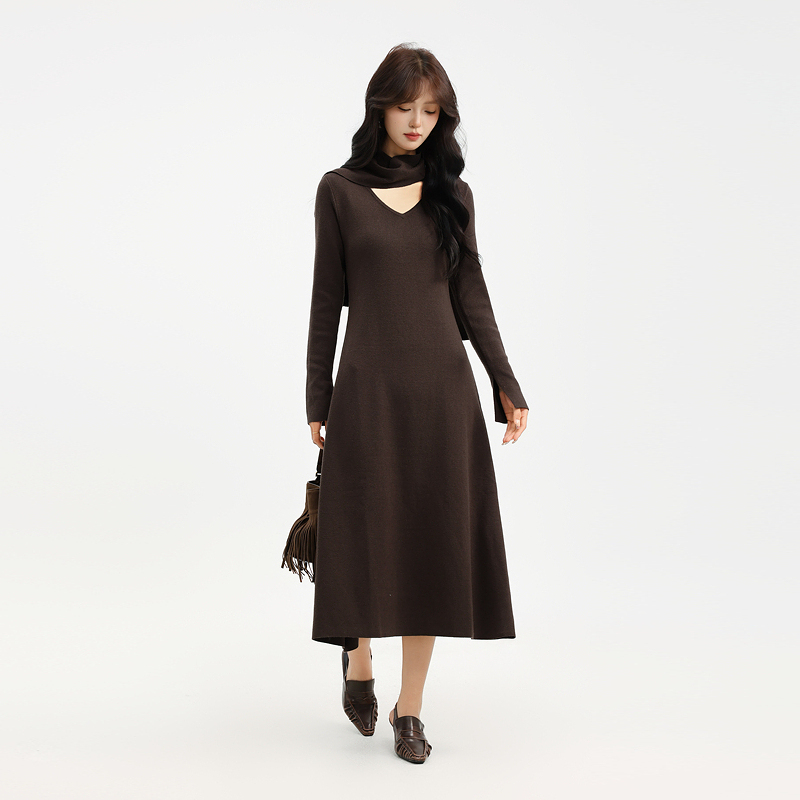 记忆的起点长袖连衣裙2025冬季新款气质针织V领长裙女69GD85004D