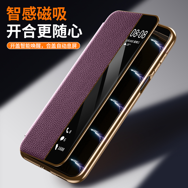 适用于华为pura80牛皮保护大荔枝纹皮套pure80pro手机壳前后对吸支架P80ultra镜头护镜智能视窗接听电话p80u