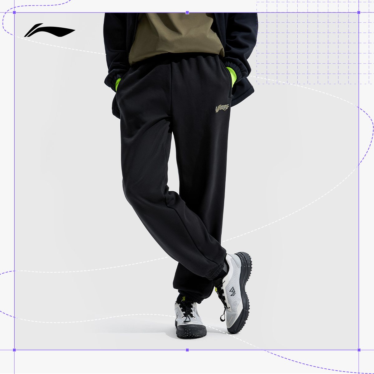 李宁卫裤男士宽松休闲裤健身跑步长裤拉链口袋加绒针织黑色运动裤