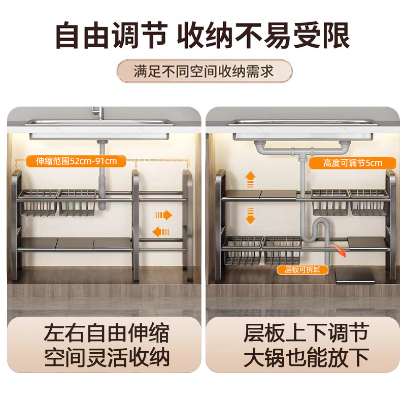 厨房水槽下收纳架可伸缩多层置物架橱柜内分层锅具下水槽台面双层
