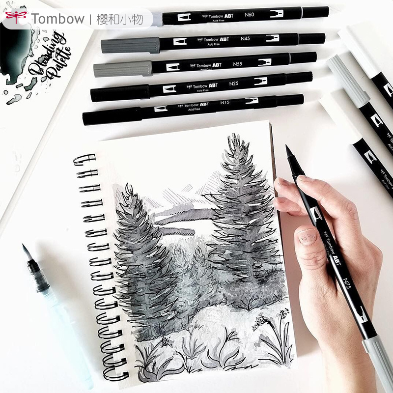 日本Tombow蜻蜓AB-T双头水彩笔黑色灰色透明色BRUSH英文艺术字体子弹笔记术推荐用笔设计填色笔软毛笔软头笔
