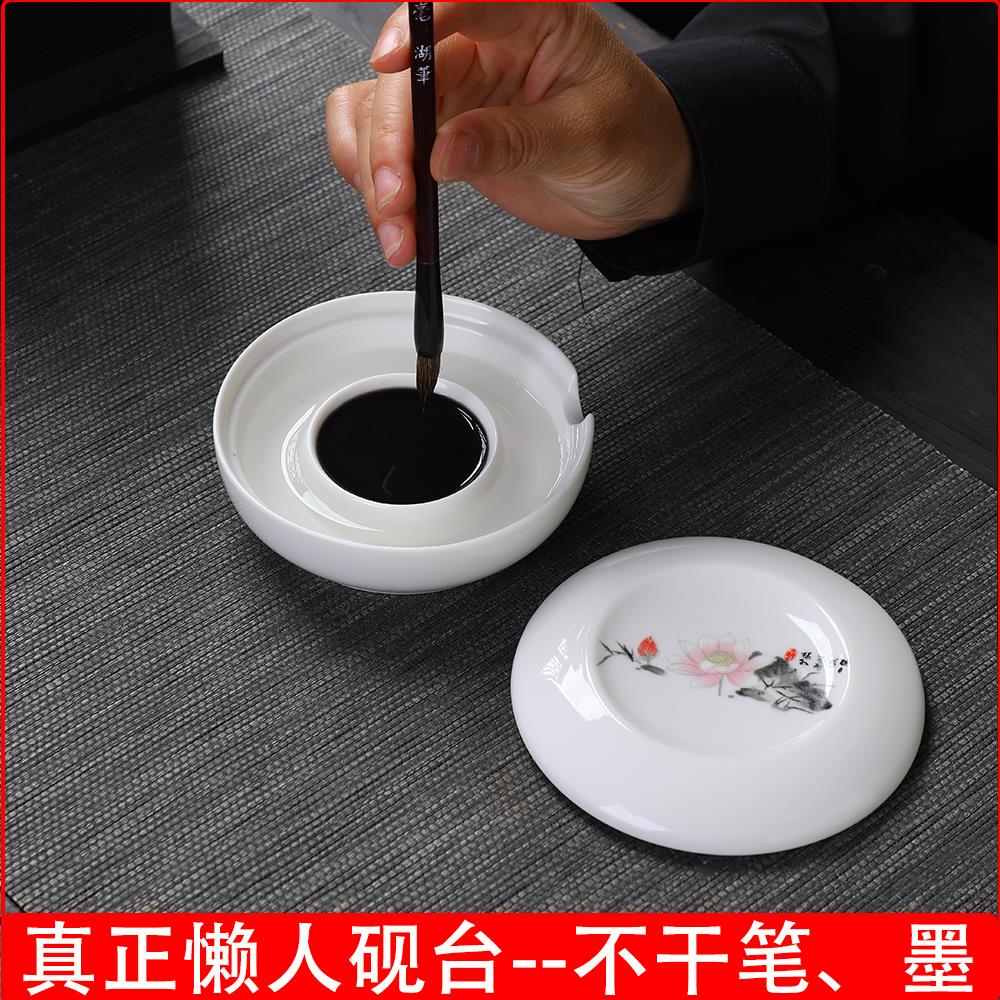 学生墨盒不干笔陶瓷火锅砚台双圈带盖不干墨毛笔碟池笔搁书法专用