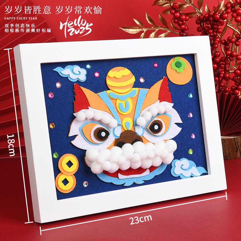 @醒狮摆件#儿童醒狮手工diy制作材料包幼儿园创意新年礼物贴画相框摆件儿童粘贴画毛球幼儿园礼物国潮不织布