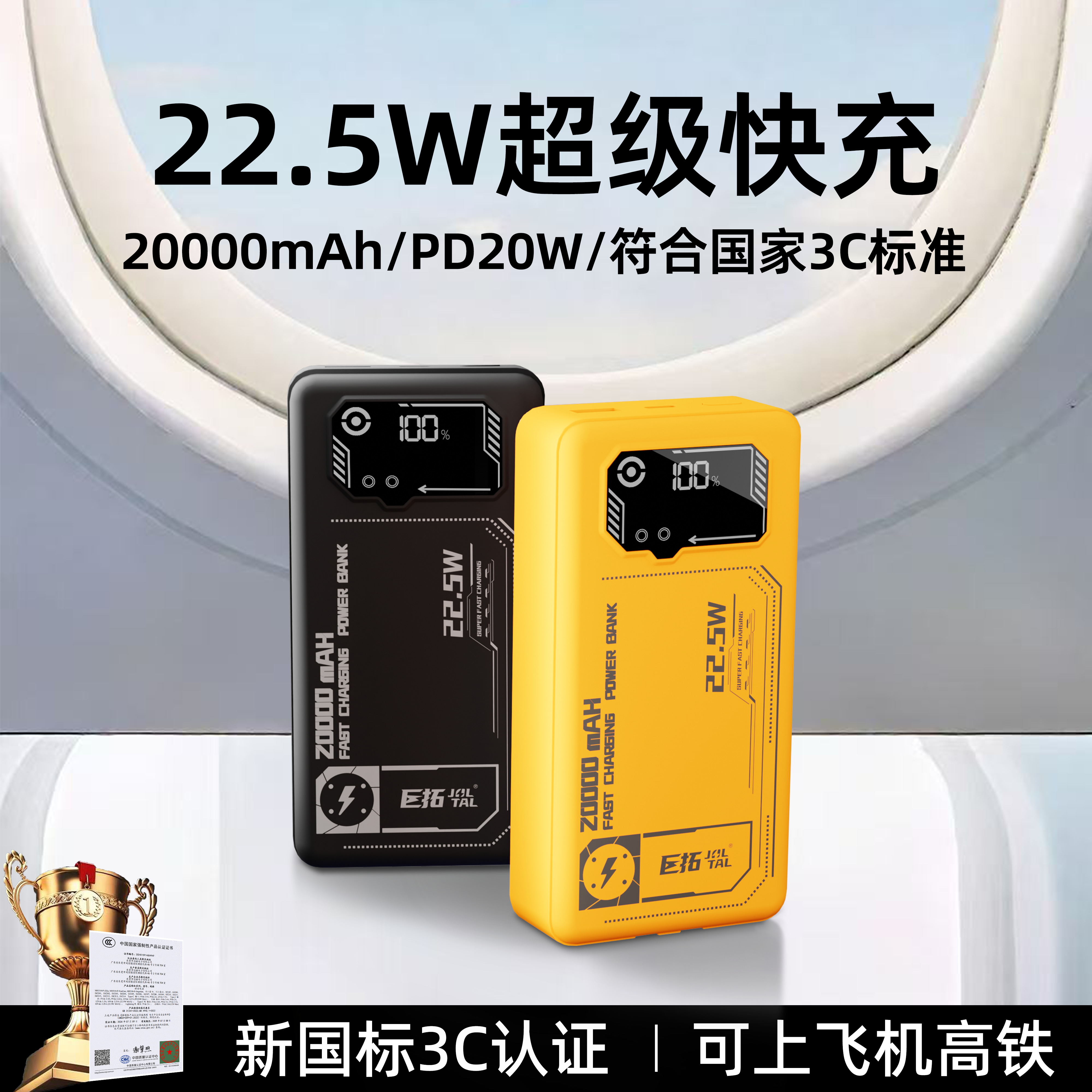 巨拓充电宝3c认证可上飞机2w移动电源20000毫安容量自带线二合一超级快充22.5w便捷适用苹果华为安卓符合国标