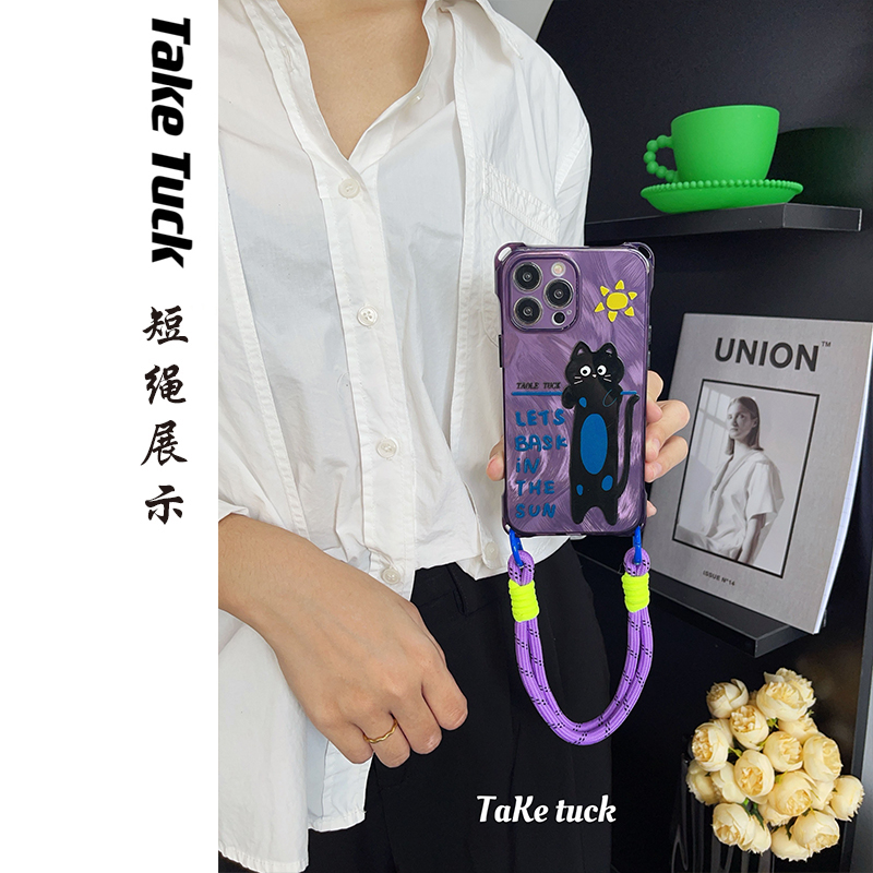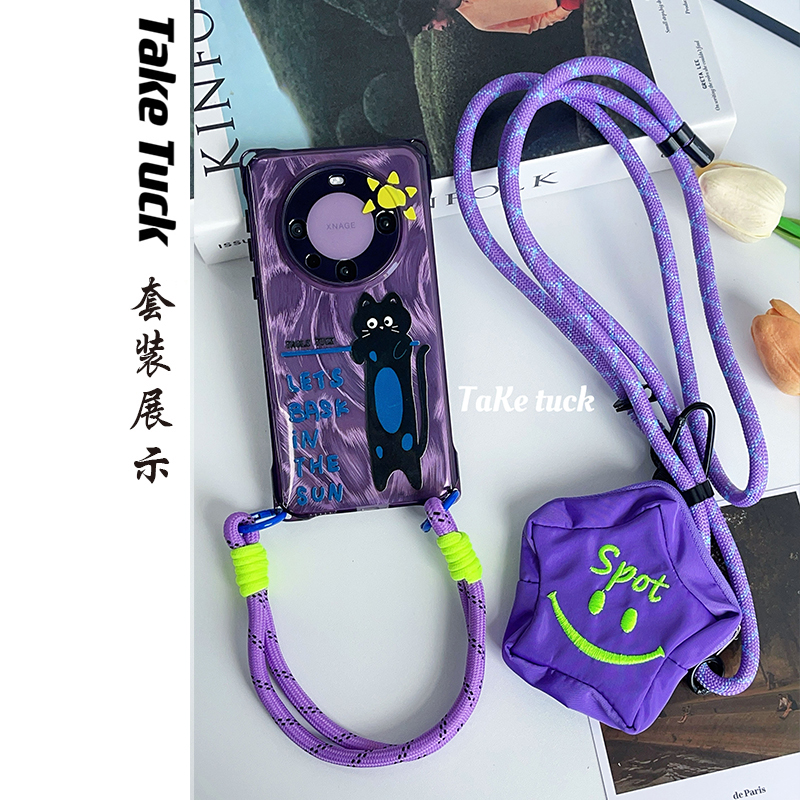 ins晒太阳的猫一体挂绳手机壳适用苹果iPhone16Promax透紫华为Pura70Pro小米15防摔趣味mate60pro软70tpu斜挎