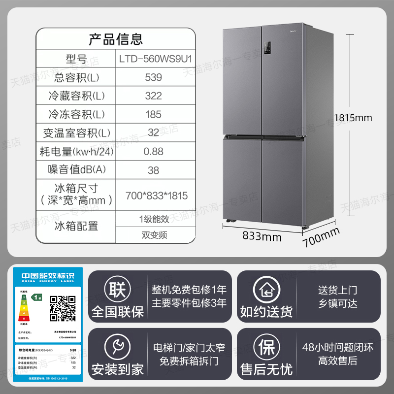 海尔冰箱Leader539升大容量家用十字四开门一级能效无霜官方旗舰
