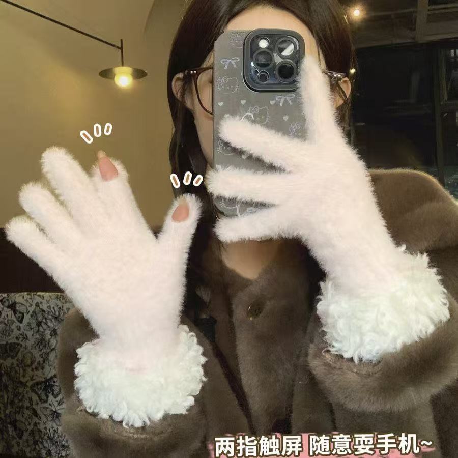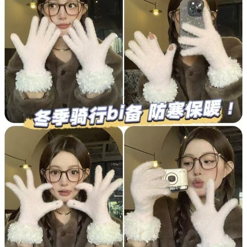 毛茸茸手套女冬季2025新款潮可触屏加绒保暖防寒骑行红色骑车白色