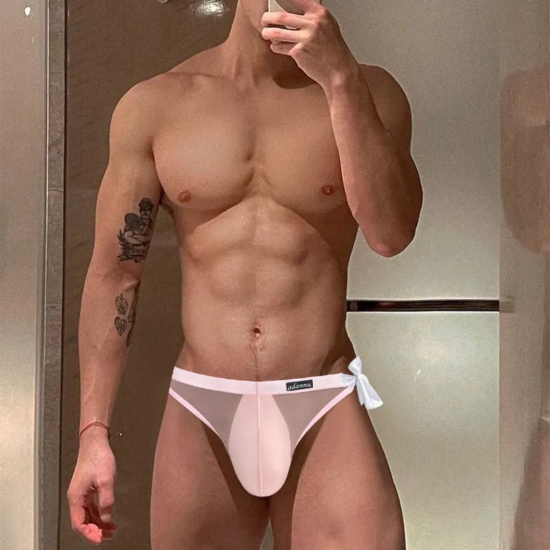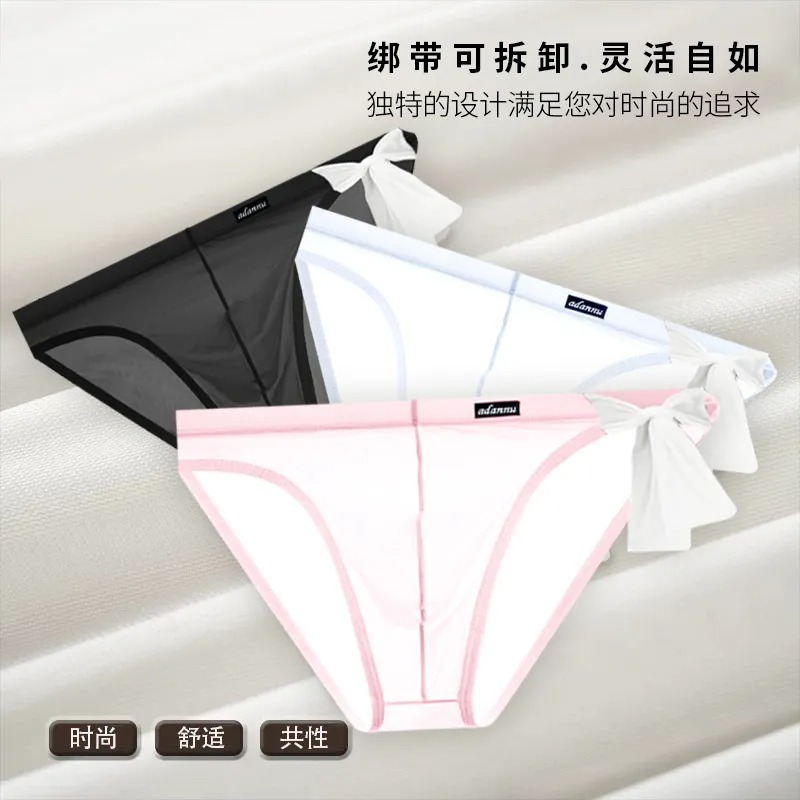 男士绑带三角裤蝴蝶结冰丝透明裤衩低腰性感国风透明设计细带可解