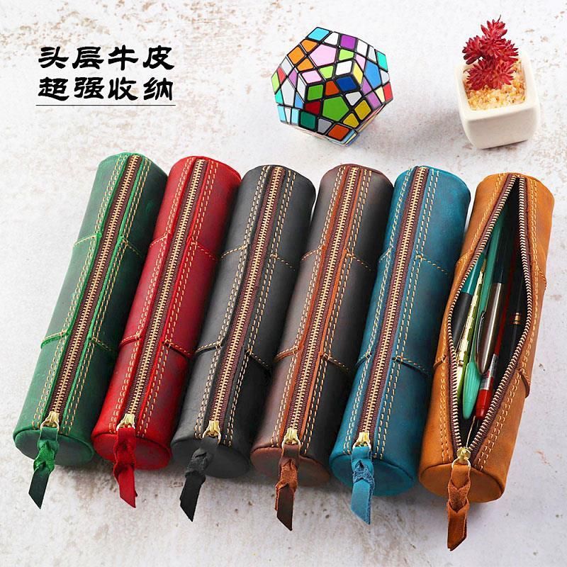 笔袋轻奢高级感疯马牛皮复古笔袋YKK拉链创意真皮手工大容量多功