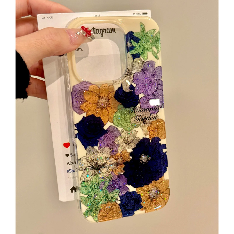 复古满屏花朵插画适用iphone16promax苹果15pro手机壳14新款13闪粉双层imd高级感镂空闪粉半透明田园风小众xs