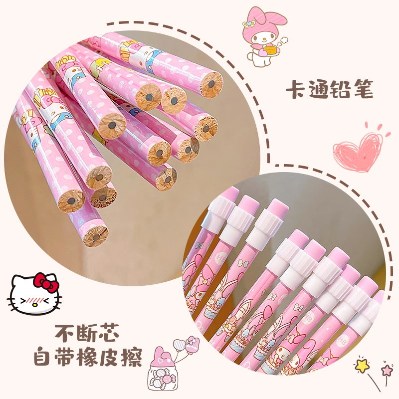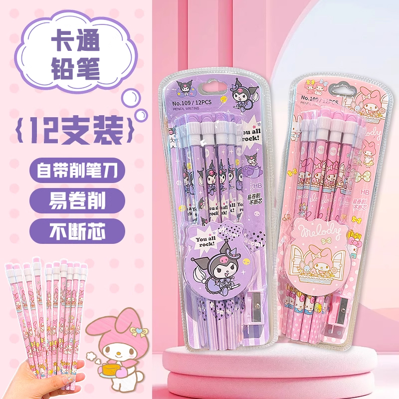 可爱铅笔送削笔刀橡皮擦HB铅笔12支装中小学生专用的铅笔幼儿园宝宝写字铅笔考生答题铅笔库洛米卡通铅笔