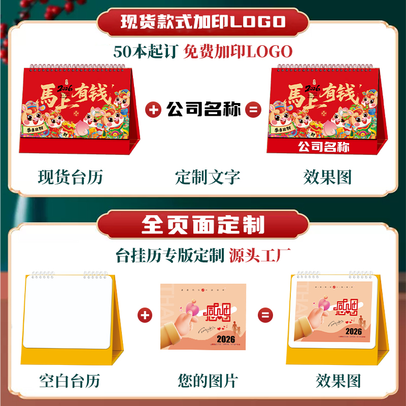 2026马年台历定制50本起免费烫金logo专版印刷企业广告定做日历中国风月历简约办公桌面摆件新版挂历来图订制