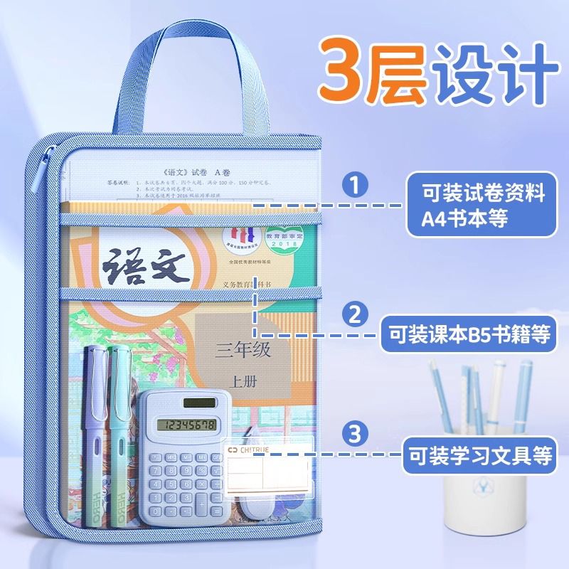 A4大开口收纳袋科目分类袋小学生文件袋试卷透明网纱拉链式手提书袋初中大容量作业补习袋资料袋A3拎书袋课本