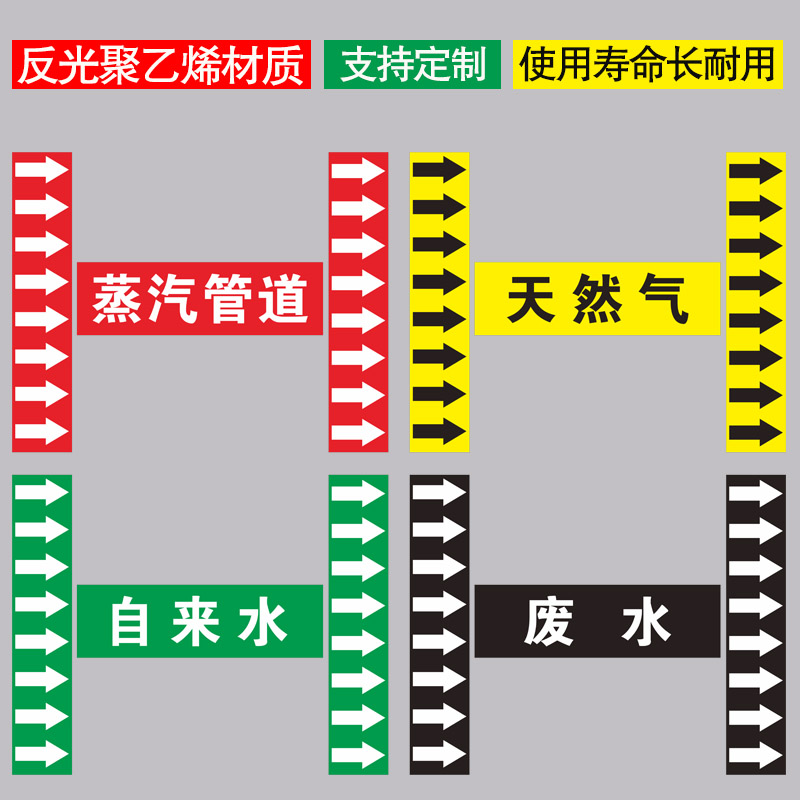 反光管道标识贴不干胶反光膜标签定制流向箭头色环胶带标示自来水压缩空气冷却水送回风防水耐高温标示贴定做