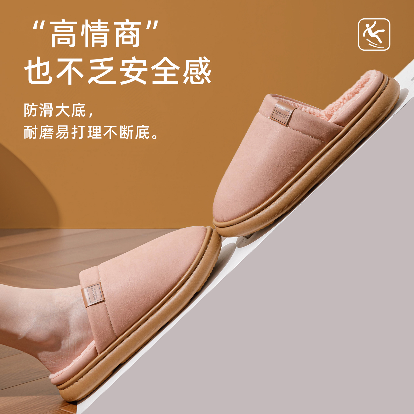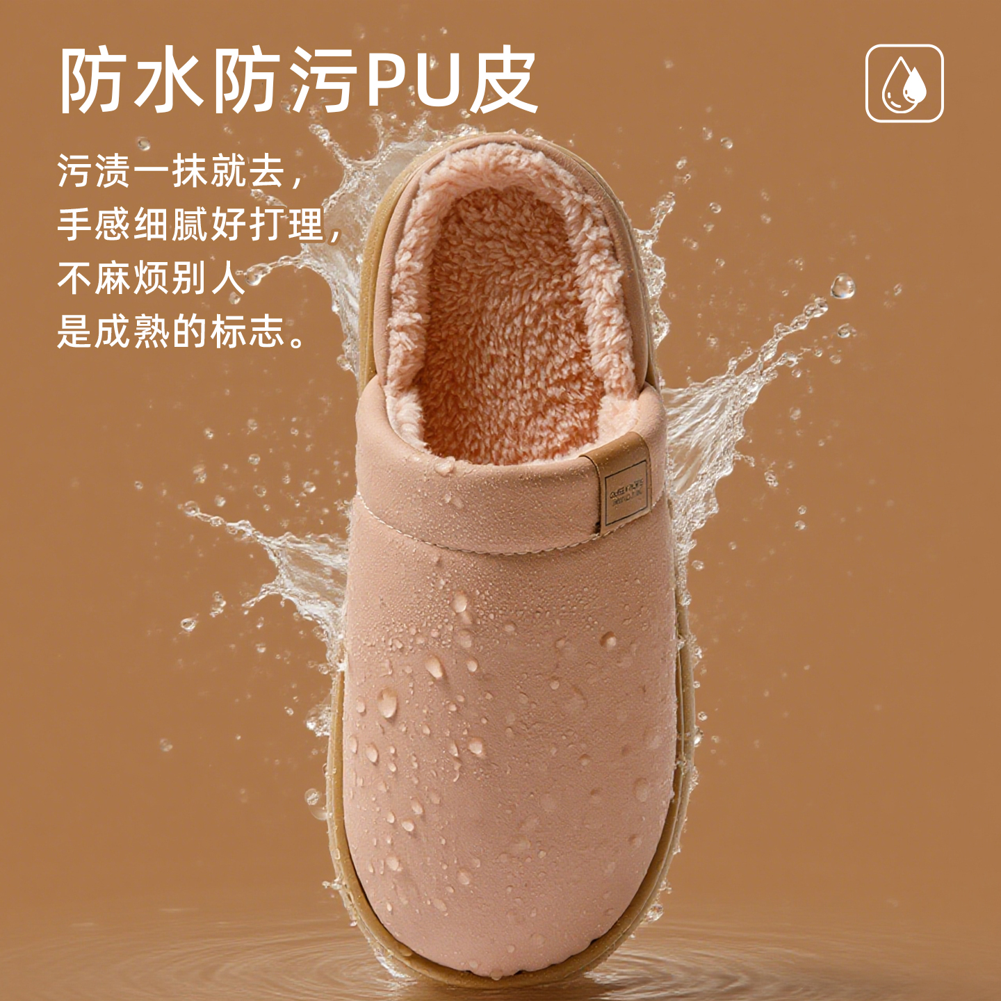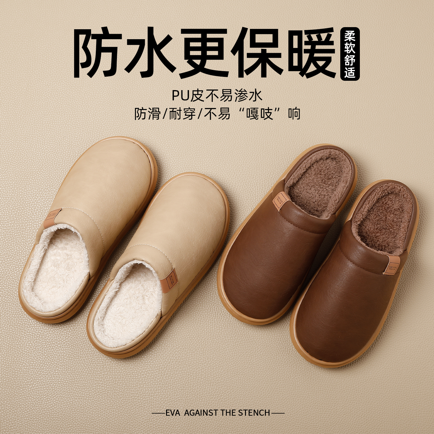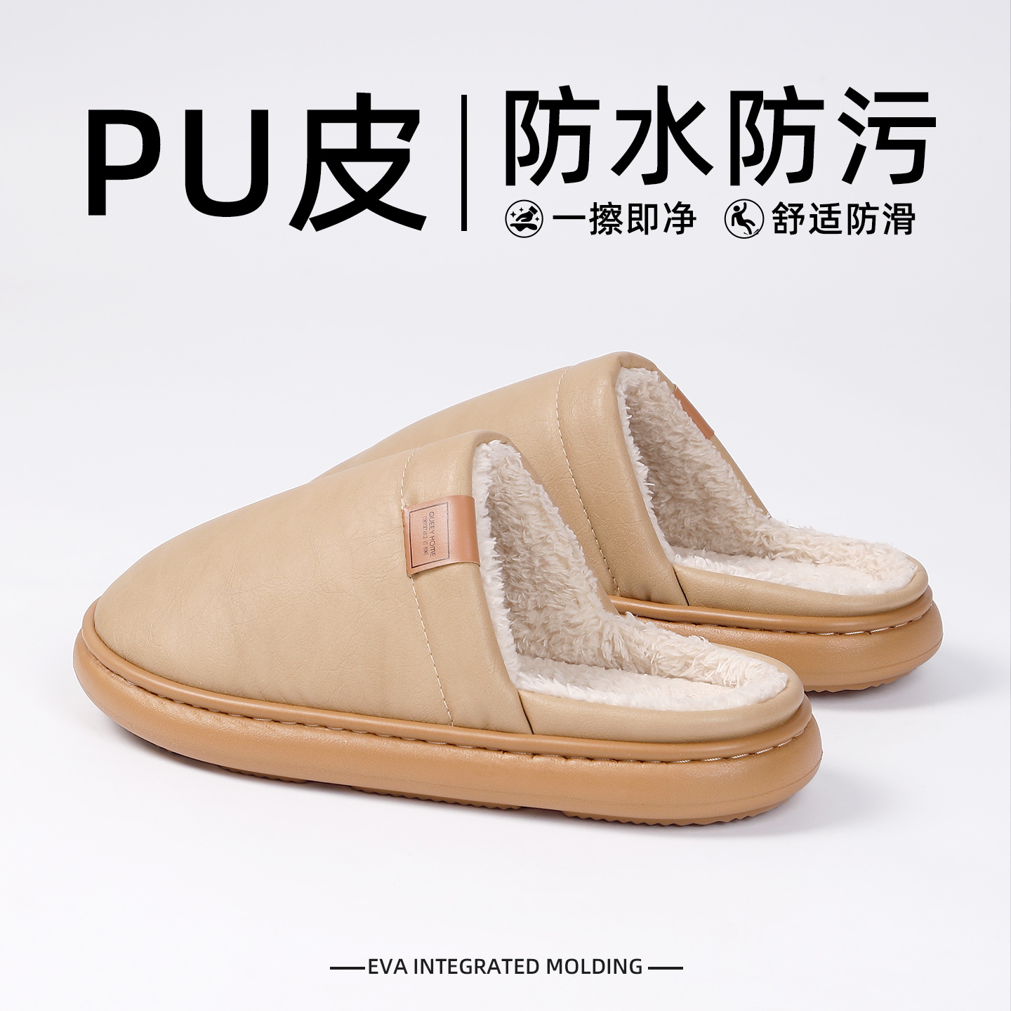 防水棉拖鞋男女冬季室内加绒保暖家居家防滑防臭抑菌PU皮拖秋冬天